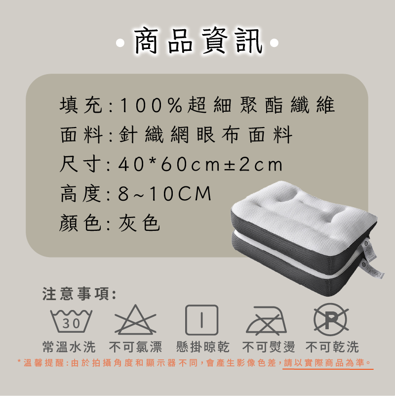 品名:【Pure Sleep】升級舒眠護頸反牽引枕芯填充物:100%超細聚酯纖維面料材質:針織網眼布適合族群:成年人、青少年尺寸:60*40*8~10CM重量:1.4kg產地:中國(台灣監製)進口商:茂榕數位科技有限公司地址:桃園市平鎮區廣東路57巷1號電話:0800-666865※此商品為睡眠使用之枕芯外布套僅供保護填充物,非供直接使用,不可拆卸使用時須另加枕頭套※注意! 枕芯屬於個人衛生用品,如經拆封或使用,概不接受退換貨,購買使用前請特別留意!※尺寸均為人工測量,若誤差在2CM以內純屬合理範圍,完美主義者請謹慎下單,最終請以實體為準。※商品為真空包裝,收到後若無法立刻成原狀,可以輕拍揉捏枕芯數下,再放置一下即會恢復原狀。