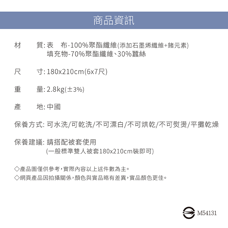 【材質】表布-100%聚酯纖維(添加石墨烯纖維+鍺元素)、填充物-70%聚酯纖維、30%蠶絲【產地】中國【內容件數與尺寸】石墨烯蠶絲被x1件 / 180x210cm±3%(6x7尺)