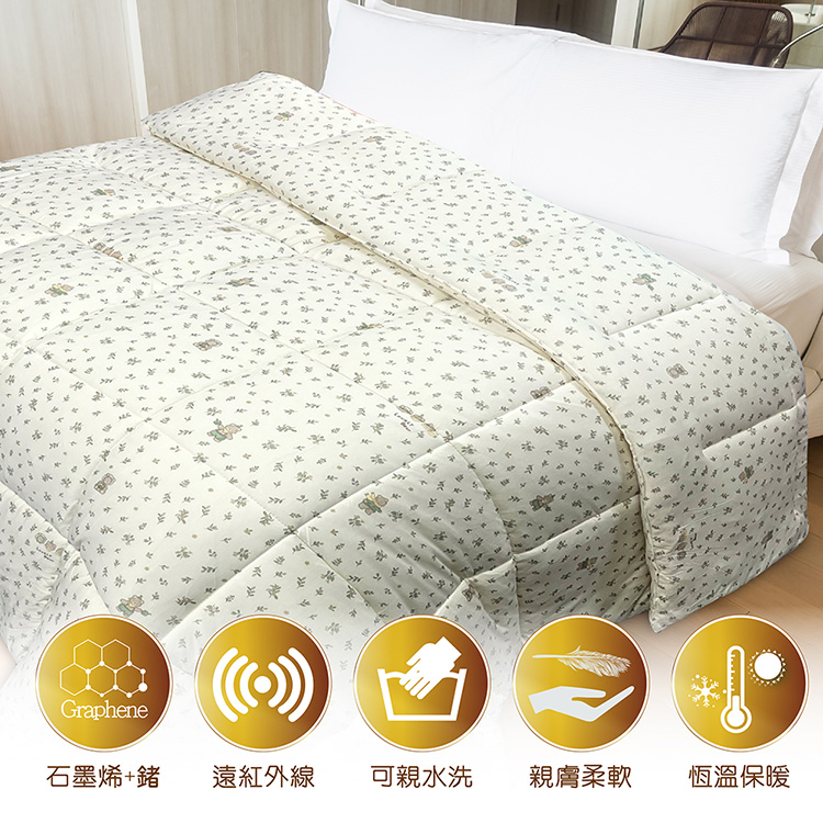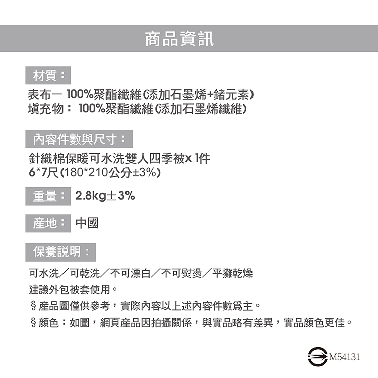 【材質】表布-100%聚酯纖維(添加石墨烯+鍺元素)、填充物-100%聚酯纖維(添加石墨烯纖維)