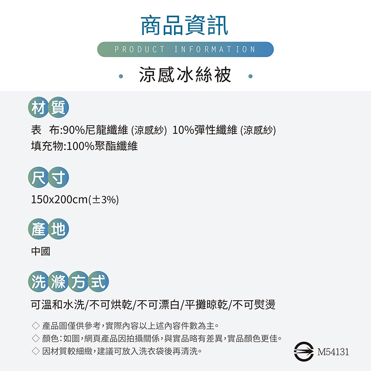 ★產地:中國★內容件數與尺寸:150*200cm -雪肌涼感紗夏涼被*1★產品圖僅供參考,實際內容以上述內容件數為主。★顏色:如圖,網頁產品因拍攝關係,與實品略有差異,實品顏色更佳。★清潔保養方式:可水洗╱不可乾洗╱不可漂白╱平放乾燥╱不可熨燙