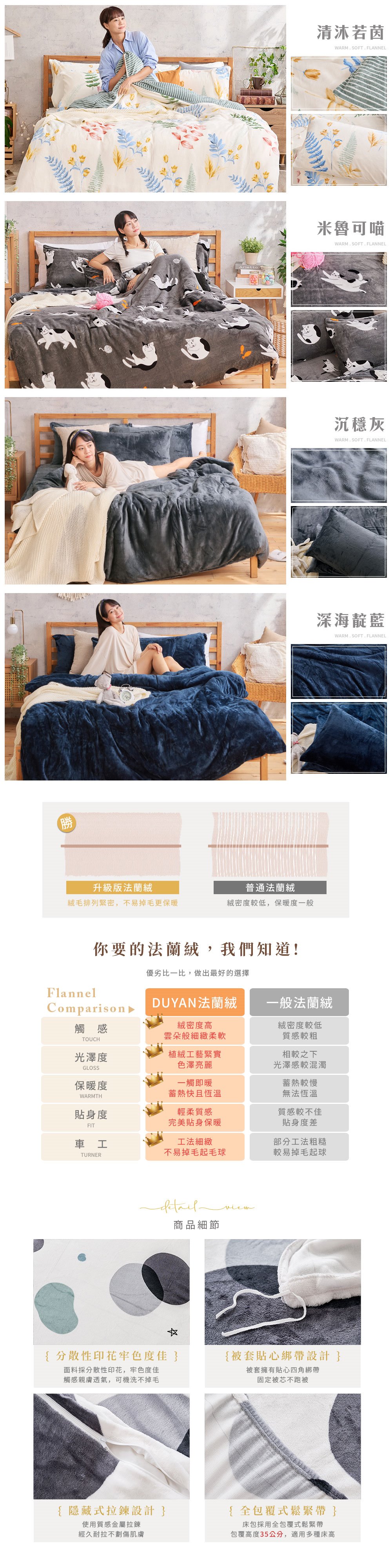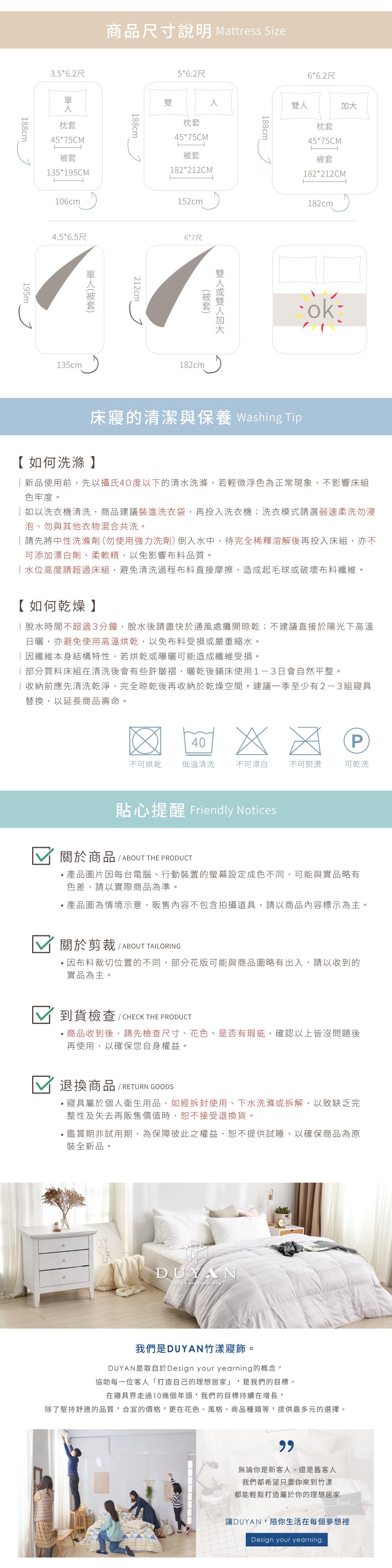 ⭐商品特色⭐● 瞬間保暖,蓄溫再升級● 觸感柔順,親膚透氣● 獨家設計花色● 專櫃級車工,精細優良⭐內容尺寸⭐▶單人三件式床包兩用毯被組單人床包3.5x6.2尺(106x188cm±3%) x1 / 可包覆床墊厚度:約35cm±5%雙人兩用毯被套6x7尺(182x212cm±3%) x1枕套(45x75cm±3%) x1 ▶雙人四件式床包兩用毯被組雙人床包5x6.2尺(152x188cm±3%) x1 / 可包覆床墊厚度:約35cm±5%雙人兩用毯被套6x7尺(182x212cm±3%) x1枕套(45x75cm±3%) x2▶雙人加大四件式床包兩用毯被組雙人加大床包6x6.2尺(182x188cm±3%) x1 / 可包覆床墊厚度:約35cm±5%雙人兩用毯被套6x7尺(182x212cm±3%) x1枕套(45x75cm±3%) x2⭐ 產品說明 ⭐▪ 材質: 100%聚酯纖維(加厚法蘭絨) ▪ 產地:中國▪ 床包:採用全包覆式鬆緊帶,可防止床包滑動▪ 枕套:美式信封枕套▪ 兩用毯被套:有四角綁繩搜尋【duyan_bedding】可看到更多商品#DUYAN其他尺寸