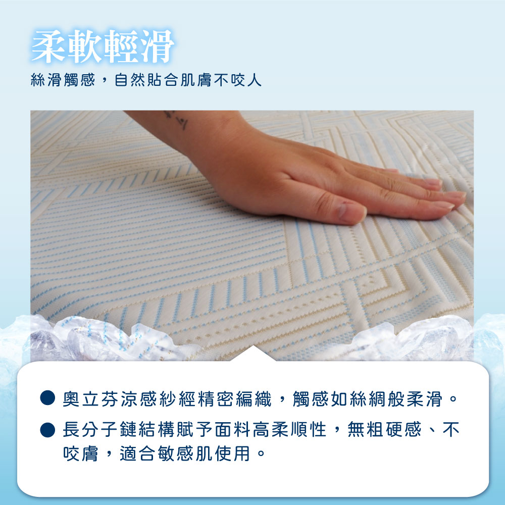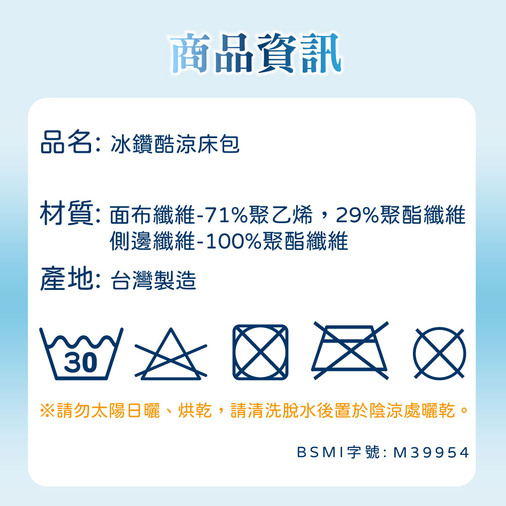 品名:【Pure Sleep 純好眠】冰鑽酷涼床包-單人面料材質:面布纖維-71%聚乙烯,29%聚酯纖維/側邊纖維-100%聚酯纖維尺寸:105*186cm(±2cm)內容:床包*1(不含枕套)產地:台灣製造經銷商:茂榕數位科技有限公司地址:桃園市平鎮區廣東路57巷1號電話:0800-666865【注意事項】※商品圖片為實物拍攝,由於螢幕顯示色差、拍攝光線等因素,照片與實物可能略有差異,請以實物為準。※商品尺寸為人工測量,標示僅供參考,難免與實際商品尺寸略有誤差,誤差尺寸±2cm為國際驗貨標準可接受範圍。※拆封商品後,若有任何問題請先聯繫客服,將有專員為您服務。※注意! 以下說明不屬瑕疵範圍:1. 小於1-3cm尺寸測量誤差、些微不對稱2. (1cm極小污點/摺痕/刮痕/螢幕色差等3. 些微脫線/勾針/線頭/味道/五金刮痕4. 人為造成損壞或使用痕跡【退貨需知】※拆封商品時,為了保障雙方權益,開封時務必錄影留證。※鑑賞期為猶豫期,並非試用期。※提醒您!商品需要全新且包裝完整的情況下,才能辦理退貨退款;床包屬於個人衛生用品,一旦經拆封或使用,易有接觸肌膚衛生疑慮,商品價值已受損,除非為瑕疵商品,否則無法受理退貨,購買使用前須特別留意,避免影響自身權益 !