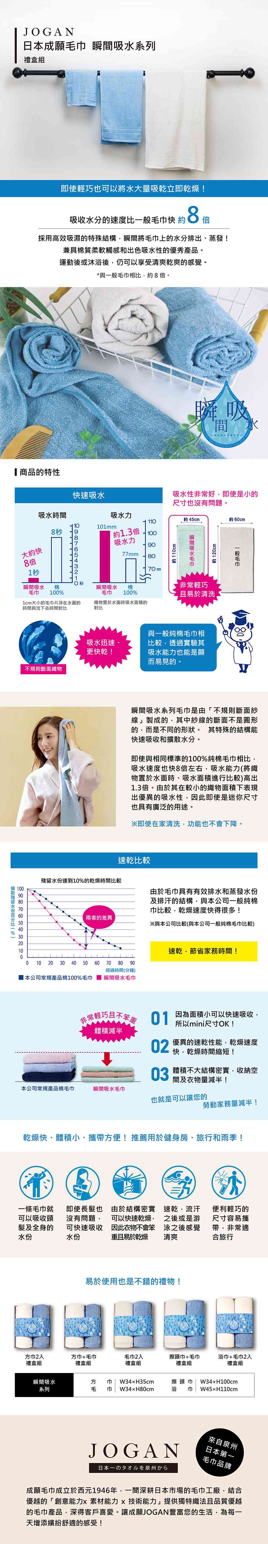 材質:棉80%+嫘縈(人造絲)20%單品尺寸:毛巾-W34×H80cm、擦頭巾-W34×H100cm、浴巾-W45×H110cm方巾-W34×H35cm禮盒尺寸 : 方巾2入-18x20x5cm方巾+毛巾-18x20x5cm毛巾2入-21x23.5x5cm擦頭巾+毛巾-21x23.5x5cm浴巾+毛巾2入-22x28x5cm重量:毛巾-130g、擦頭巾-150g、浴巾-200g、方巾-70g產地:日本