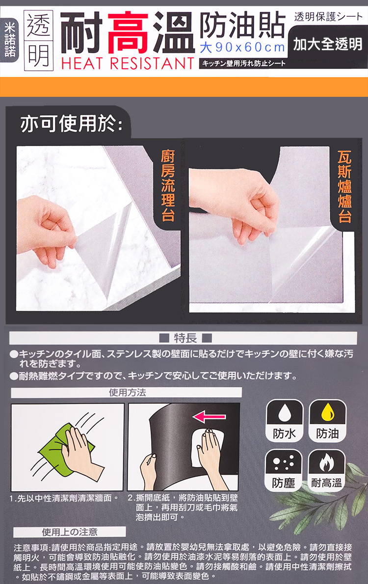 耐高溫防水防油處理,大尺寸設計輕鬆好清洗,可DIY自行裁切適合大小,烹飪料理工作好幫手。