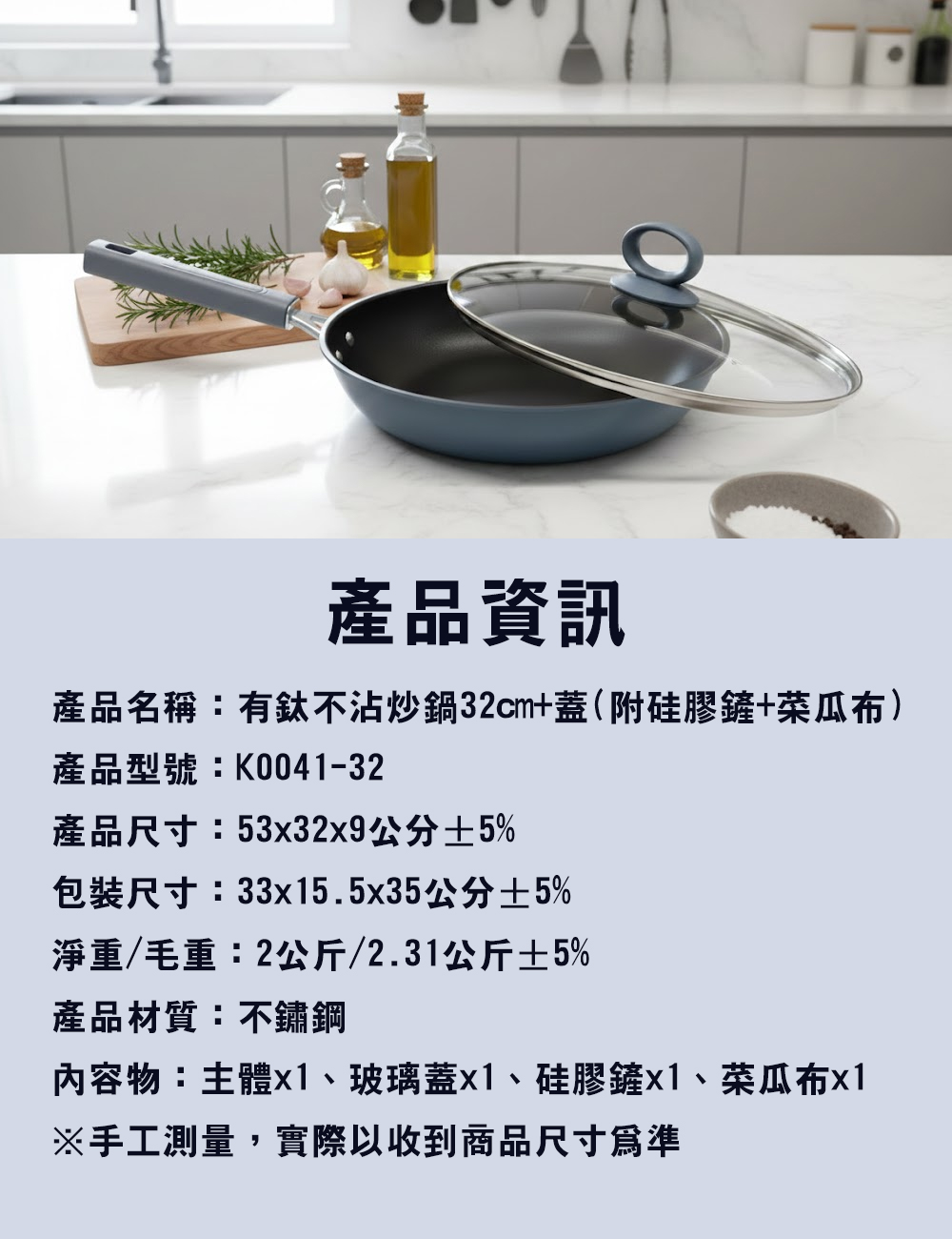 ◆隨附矽膠鏟與菜瓜布,開箱即可使用產品名稱:【廚藝寶】有鈦不沾炒鍋32cm+蓋(附硅膠鏟+菜瓜布)