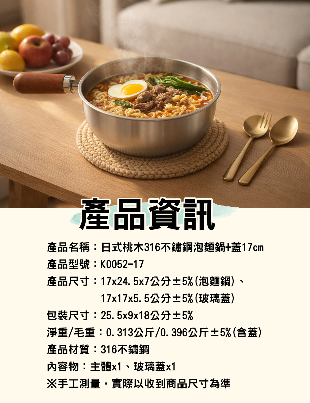 產品尺寸:17x24.5x7公分±5%(泡麵鍋)、17x17x5.5公分±5%(玻璃蓋)