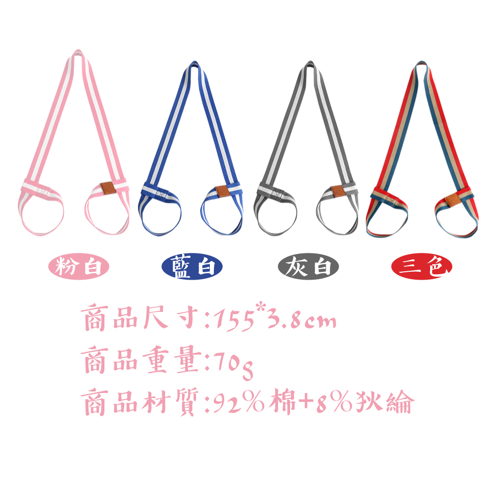 【產品特色】◆用料實在,不易破損斷裂 ◆活扣設計,打叉固定◆高拉力,抗耐磨,縮水率小,彈性適度◆簡單設計,輕鬆將瑜珈墊帶著走 ◆一帶兩用,可當瑜珈伸展帶使用 ◆多種顏色,選出自己的個人特色◆適用於捆綁5~15mm厚的瑜伽墊【產品規格】尺寸:155*3.8cm*0.15CM 重量:3.7±0.2g材質:棉質 顏色:黑色,玫红,大红,紫色,深紫,蓝色,草绿,橙色,粉色,灰色