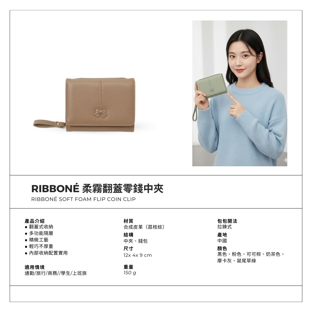 【產品介紹】風格主題:Ribboné 韓系柔霧 × 甜感氣質採用細緻柔霧荔枝紋皮革,觸感溫潤;翻蓋設計搭配立體蝴蝶結金屬飾,展現俏皮又不失質感的韓系調性。內部設有卡片層與大容量零錢袋,小巧外型卻兼顧實用性與時髦。柔霧質感結合蝴蝶結細節,展現可愛與氣質並存的日常風格。小巧尺寸卻擁有完整收納,通勤、約會都恰到好處。適合喜歡甜感、氣質風格的女性;學生與輕熟族皆適用。內側有零錢包夾層設計,左右兩側皆有卡位。好分類好收納,大小適中。共有8個卡槽(可放超過8張卡片)1個零錢收納層,一個鈔票夾層,3個雜物收納夾層(發票、護身符、雜物等)【產品規格】材質: 高質感 PU 合成皮革(柔霧荔枝紋)結構: 翻蓋開合 × 多卡層 × 鈔票層 × 零錢拉鍊袋 × 透明證件夾尺寸: 12 × 9 × 4 cm重量: 約 150 g顏色:黑色、粉色、可可棕、奶茶色、摩卡灰、鼠尾草綠#蝴蝶結 #柔霧荔枝紋 #翻蓋設計 #輕甜韓風 #中夾 #女夾 #皮夾 #女性中夾#休閒 #潮流 #韓系 #韓版 #女性 #少女 #上班族#情人節禮物 #七夕 #聖誕節禮物