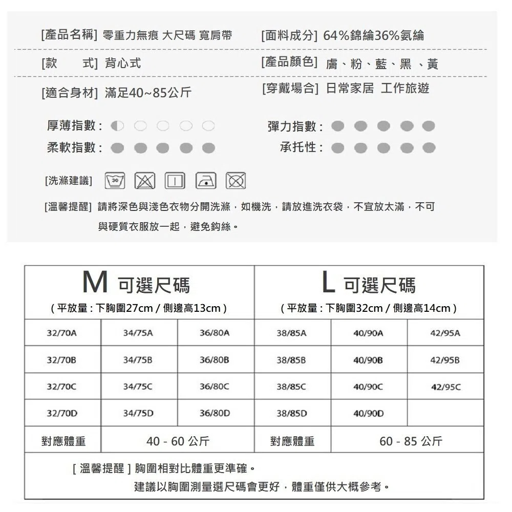 【A&R】零重力無痕大尺碼寬肩帶顏色:膚尺寸:L(適合60-85KG)成份:64%錦綸、36%氨綸產地:CHINA●此為私密物品,只提供鑑賞,退貨需保持無使用過且吊牌未拆剪及未下水過的狀態●退貨請於鑑賞期內辦理,必須保持吊卡完整及商品組合之齊全(包含購買商品、附件、內外包裝及包裝彩盒、贈品…等,均務必保持完整齊全)●產品顏色因每台螢幕顏色解析及設定的不同,多少會有些微色差,請以實品為主注意事項:布料染料時,深色比淺色不易固色,因此深色衣服下水時,會見水中有許色水,此屬正常現象,請您別擔心,請安心穿著!洗滌方法:手洗(深色衣物與淺色衣物請分開洗,請勿浸泡) ,可以使用洗衣機、脫水機清洗,請使用中性洗劑,加入少許清水,待充分溶解後再放入衣物清洗。#A&R #零重力 #無痕 #大尺碼 #寬肩帶 #AIR SKIN BRA #透氣 #無鋼圈