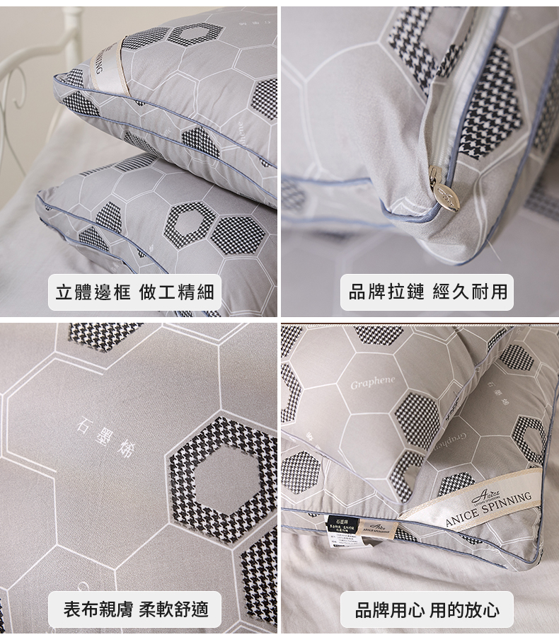 產品 :石墨烯羽絲絨枕表布:100%聚酯纖維(馬來西亞製造)(內含30%石墨烯纖維)填充:100%聚酯纖維(台灣填充製造)規格:48x75cm ±5%中枕:內填充1KG羽絲絨