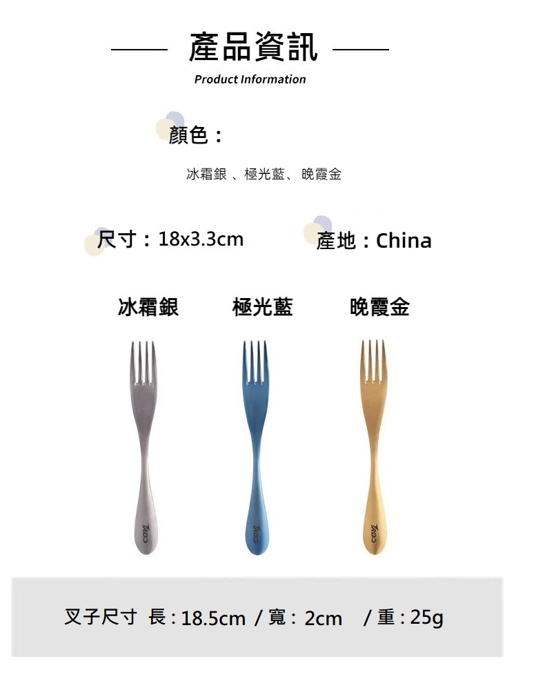 【A&R】簡約輕奢抗菌防滑純鈦叉子餐具 單入 材質 : 純鈦 尺寸 : 18.5x2cm 顏色 : 冰霜銀 產地 : China 包裝採用精美絨布束口餐具袋 湯叉使用注意事項: - 為避免受傷,請勿拿來玩耍 - 請勿讓幼童單獨使用 - 家中幼童使用時,需有大人陪同並留意小心安全使用 - 請妥善保管於孩童不易取得場所 為維持鈦表面美觀,建議清洗後以乾布拭乾,畢免水漬痕跡殘留。 鈦餐具商品系列為亮面金屬商品,生產過程會產生細紋乃正常現象。 產品尺寸皆為手工測量,因測量方式有所不同,誤差1-2cm屬合理範圍。 網頁照片為參考,因拍攝光線與電腦顯示器不同,請以實品為準。 追求完美者,請斟酌考慮後購買。謝謝! 網路購物您享有商品到貨七天猶豫期,隨時解約退貨之權益,但提醒您注意,商品退貨時必須為全新狀態且完整包裝。 #A&R #簡約 #輕奢 #抗菌 #防滑 #純鈦 #叉子 #餐具 #單入 #環保 #健康 #居家 #戶外 #野餐 #露營 #輕量