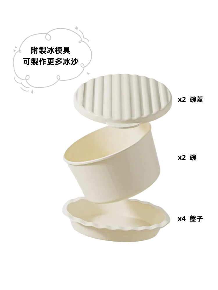 內容物 : 刨冰機x1+碗蓋x2+碗x2+盤x4+LOGO貼紙