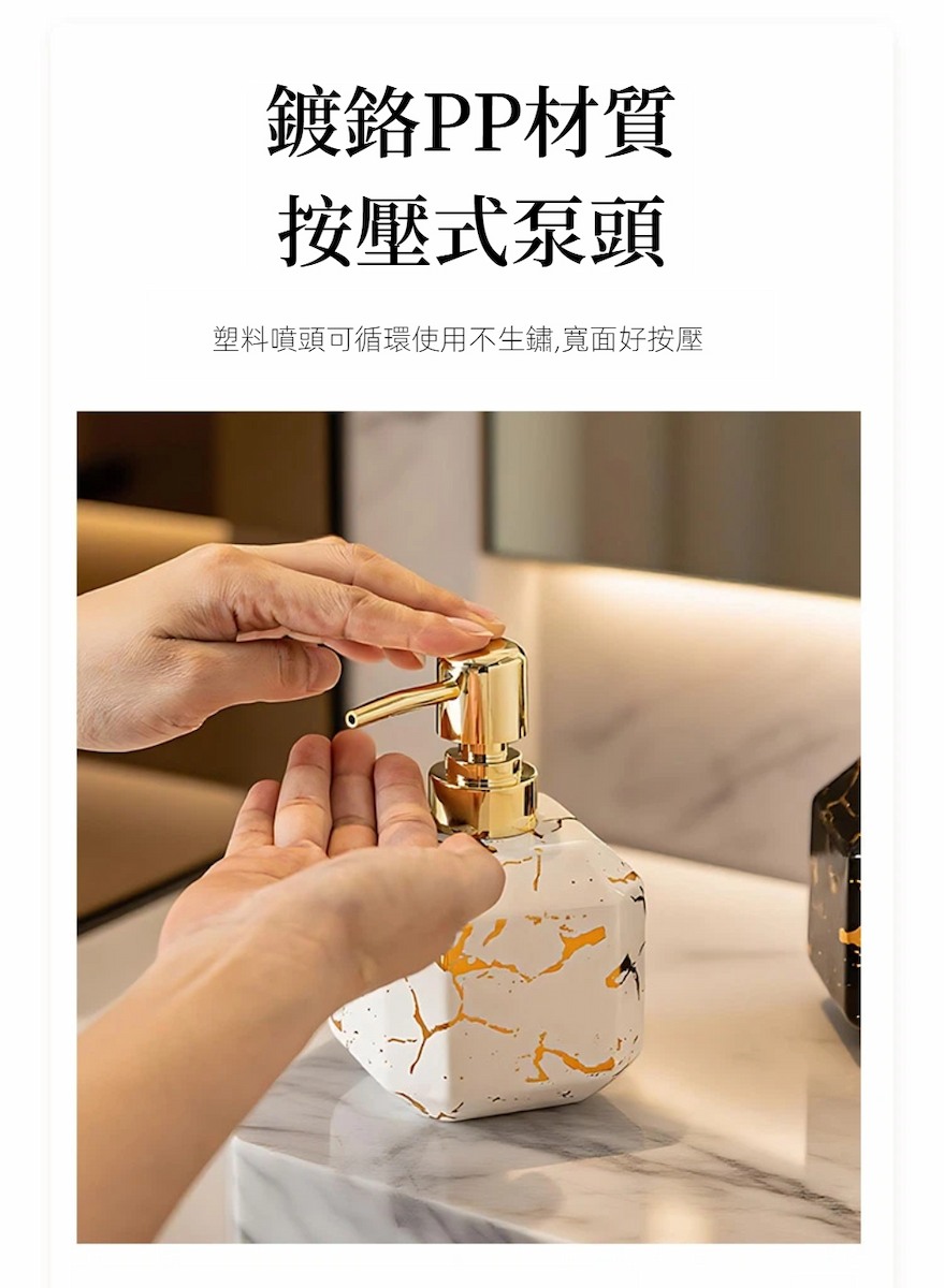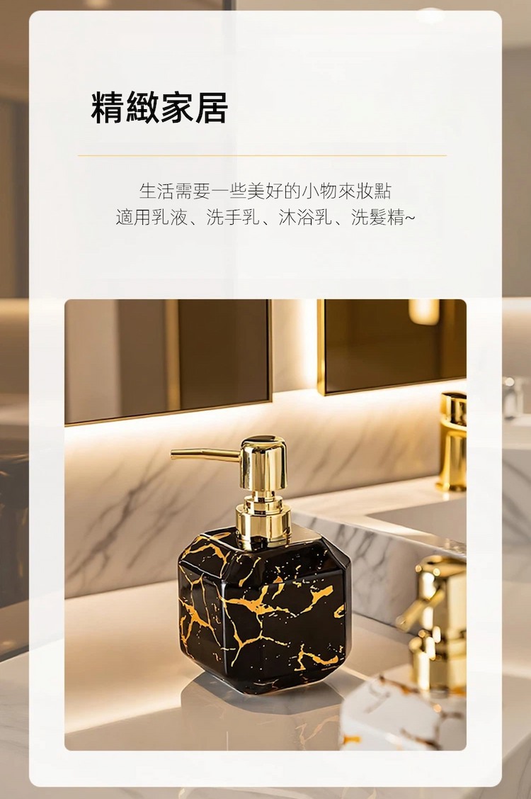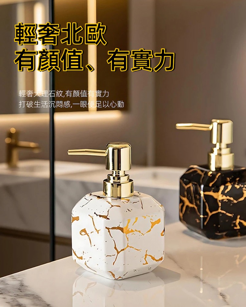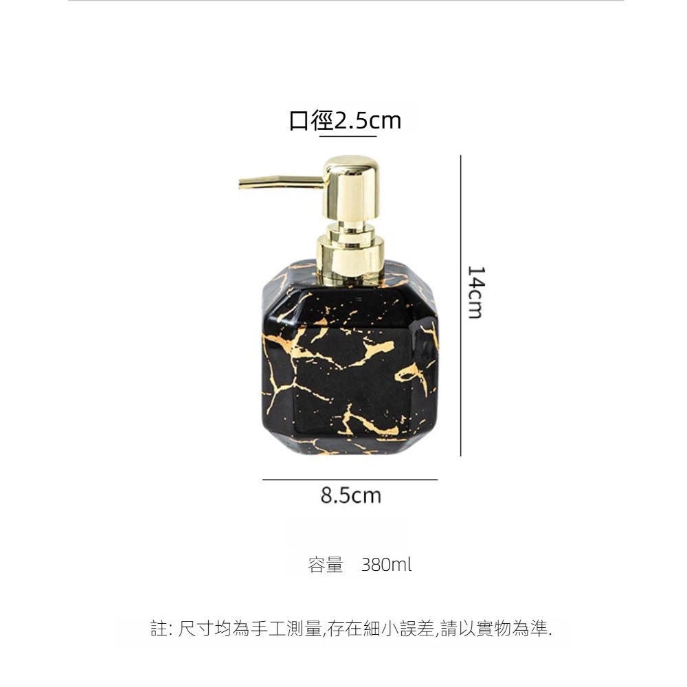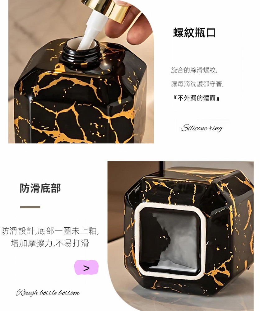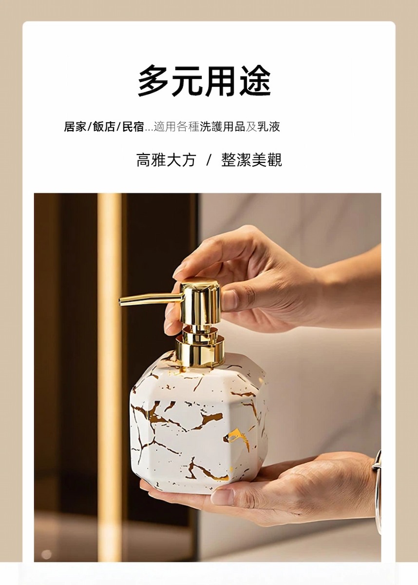 【A&R】御石鎏金陶瓷洗護按壓瓶 380ML容量 : 380 ml材質 : 陶瓷(瓶身)、PP(按壓頭/內管)顏色 : 雲石白尺寸 : 14 × 8.5 cm(口徑 2.5 cm)重量 : 約 220 g產地 : China『產品優點』1. 高質感陶瓷瓶身,提升空間美感大理石紋陶瓷設計,搭配鎏金按壓頭,低調奢雅,輕鬆升級洗手台與客房質感。2. 按壓式設計,使用順手不滴漏滑順按壓頭搭配螺紋瓶口與矽膠密封圈,出液穩定、不易外漏。3. 防滑底部設計,擺放更安心底部止滑處理,增加摩擦力,日常使用不易滑動或傾倒。4. 380 ml 大容量,減少補充頻率適合洗手乳、沐浴乳、洗髮精等多種洗護用品,居家或飯店客房皆適用。5. 黑白雙色可選,風格百搭雲石白、曜石黑兩款顏色,輕鬆搭配各種居家與旅宿空間風格。『溫馨小提醒』尺寸皆為人工測量略有誤差,顏色因顯示器而有所不同,請以收到實物為主。