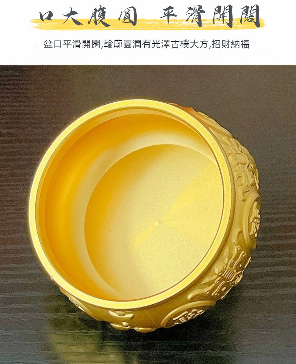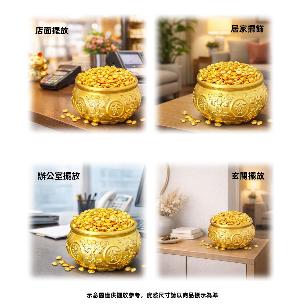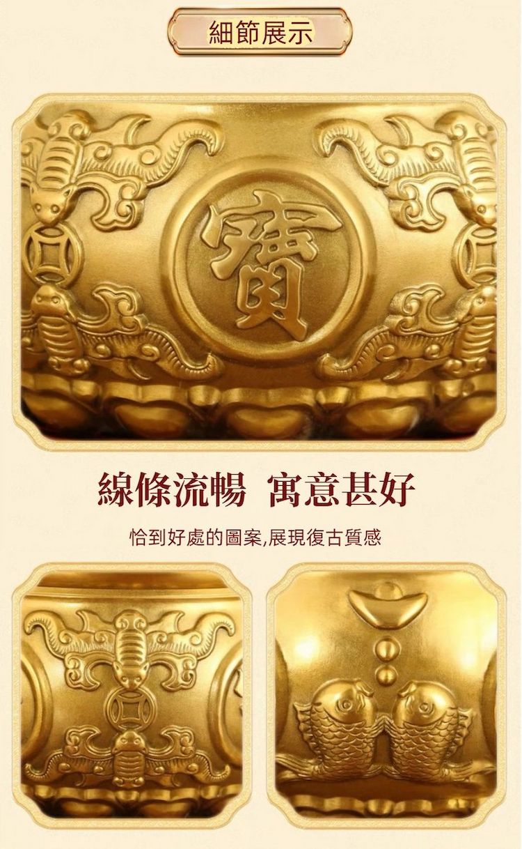 【A&R】招財開運 八福雙魚聚寶盆附小元寶款式:中款材質:黃銅尺寸:6 × 6 × 3.5 cm重量:370 g產地:China內容物:八福雙魚聚寶盆(小元寶約 400 顆)×1『必買優點』1. 八福雙魚寓意・招財聚富雙魚象徵「年年有餘、財源不斷」,搭配「福」字與滿滿元寶,寓意 招財進寶、富貴聚財、好運加倍,不只是擺飾,更是好兆頭。2. 黃銅材質・沉穩有份量整體採用 黃銅打造,色澤溫潤不浮誇,實際拿在手上有重量感,擺放穩固、不易傾倒,質感一看就不同。3. 線條流暢・復古細節到位立體浮雕工藝,紋路細膩、比例協調,圖騰雕刻恰到好處,展現 復古吉祥美感,耐看不俗氣。4. 盆口圓潤・內部光滑好清潔盆口圓順平滑,邊緣不刮手,內部拋光處理,放元寶、硬幣或飾品都好整理,實用又美觀。5. 開運送禮・自用擺設都合適不論是 開店開業、入厝喬遷、新年送禮,或是居家、櫃檯、辦公桌擺放,都非常討喜、有祝福感。『溫馨提醒』1. 尺寸皆為人工測量略有誤差,顏色因顯示器而有所不同,請以收到實物為主。2. 本商品內含小元寶配件,請避免幼兒或寵物拿取,以免誤食,使用時請留意擺放位置。