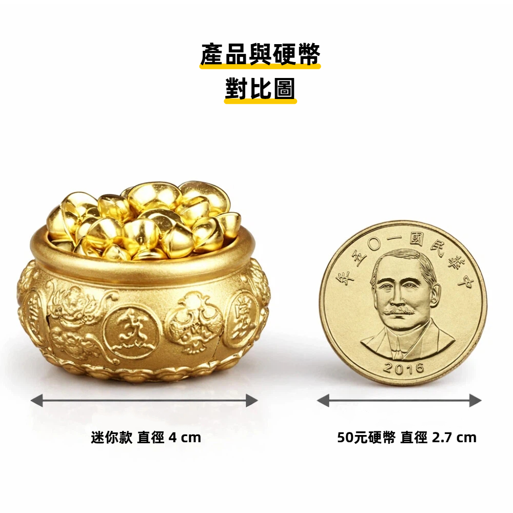 【A&R】招財開運 八福雙魚聚寶盆附小元寶款式:迷你款材質:黃銅尺寸:4 × 4 × 2.5 cm重量:117 g產地:China內容物:八福雙魚聚寶盆(小元寶約 120 顆)×1『必買優點』1. 八福雙魚寓意・招財聚富雙魚象徵「年年有餘、財源不斷」,搭配「福」字與滿滿元寶,寓意 招財進寶、富貴聚財、好運加倍,不只是擺飾,更是好兆頭。2. 黃銅材質・沉穩有份量整體採用 黃銅打造,色澤溫潤不浮誇,實際拿在手上有重量感,擺放穩固、不易傾倒,質感一看就不同。3. 線條流暢・復古細節到位立體浮雕工藝,紋路細膩、比例協調,圖騰雕刻恰到好處,展現 復古吉祥美感,耐看不俗氣。4. 盆口圓潤・內部光滑好清潔盆口圓順平滑,邊緣不刮手,內部拋光處理,放元寶、硬幣或飾品都好整理,實用又美觀。5. 開運送禮・自用擺設都合適不論是 開店開業、入厝喬遷、新年送禮,或是居家、櫃檯、辦公桌擺放,都非常討喜、有祝福感。『溫馨提醒』1. 尺寸皆為人工測量略有誤差,顏色因顯示器而有所不同,請以收到實物為主。2. 本商品內含小元寶配件,請避免幼兒或寵物拿取,以免誤食,使用時請留意擺放位置。