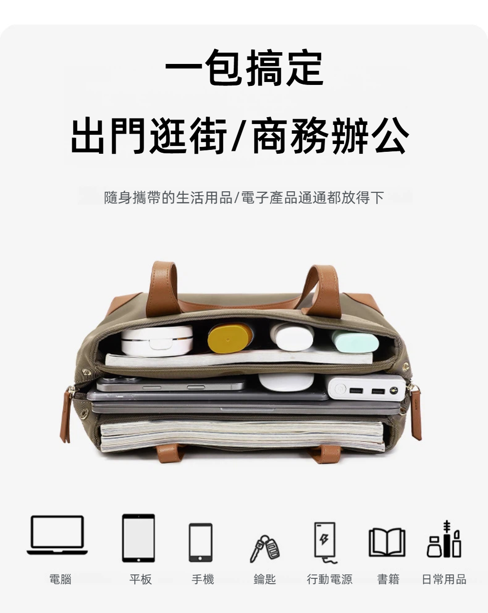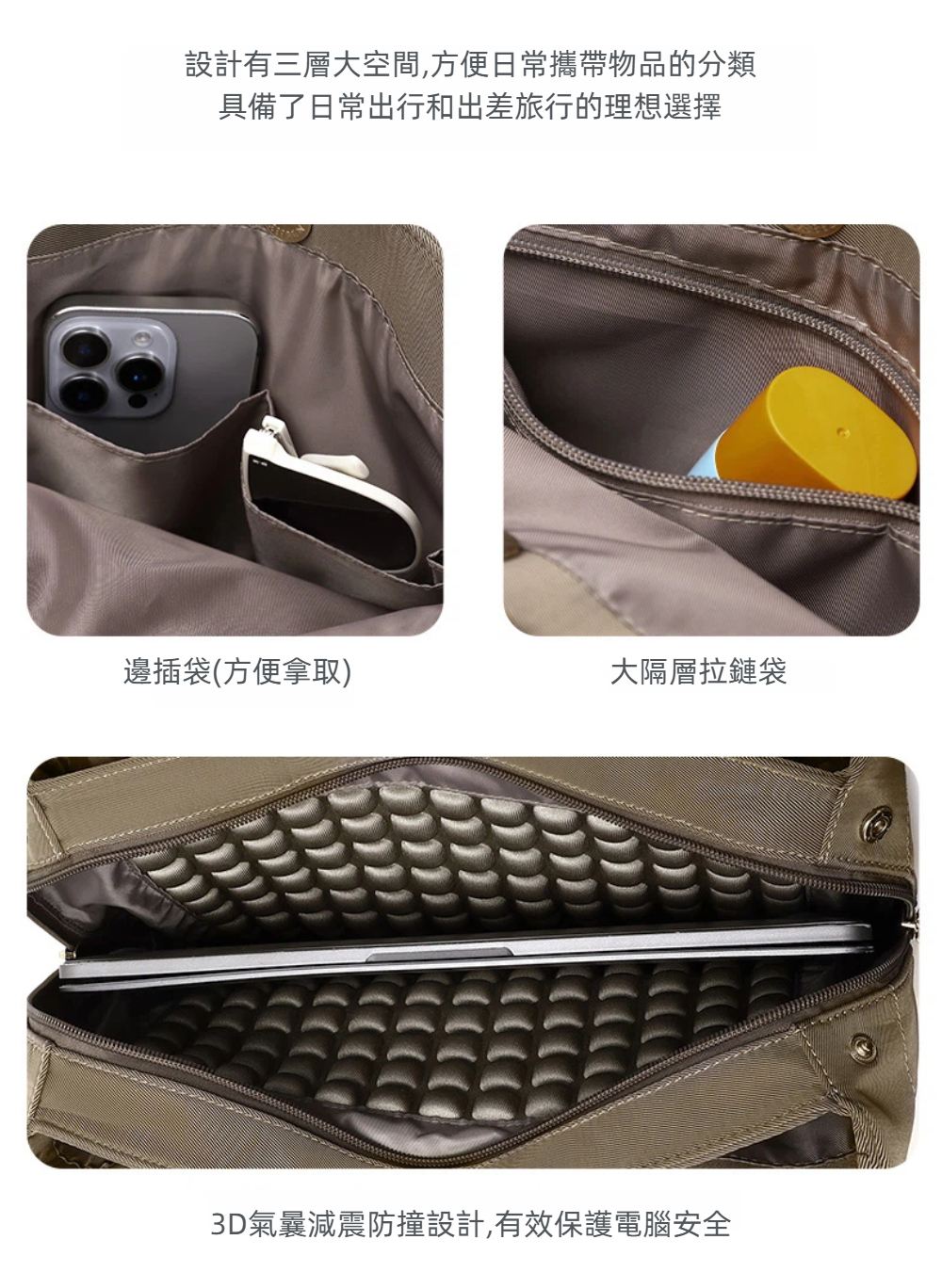 1. 大容量三層收納設計 : 筆電、文件、日常用品分類收納,通勤更有條理