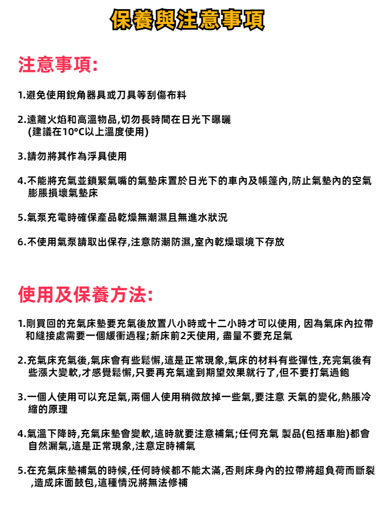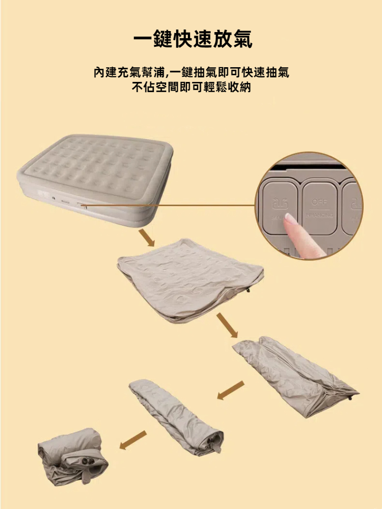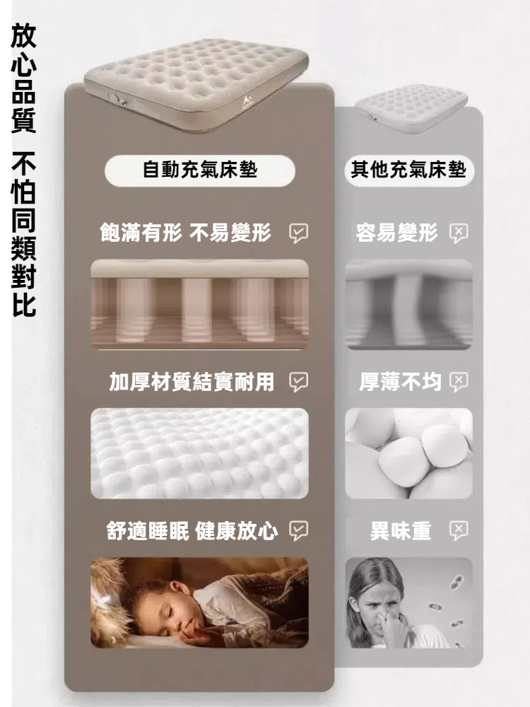 【A&R】升級電動幫浦戶外露營自動充氣床 雙人加大款材質:極細植絨面(溫柔觸感)、強韌塑膠布(PVC)尺寸:200x180x25cm顏色:卡其重量:6kg最大承重:300kg適用於:露營用、戶外、大型車上、居家皆可使用配件 : 5代新款充氣泵x1、三用氣嘴x1、type-c充電線x1、枕頭x2、修補包+膠水x1、收納袋x1(顏色隨機出貨)◆ 充氣床屬於消耗品,使用壽命依個人使用方式有所不同,僅新品保固30天,若可接受再購買。◆ 保固:30,充氣床屬於消耗品若人為因素破壞損傷則不在保固內,收到商品時若有瑕疵,請於鑑賞期內反映,一經充氣使用已無法恢復原貌恕無法辦理退貨。◆ 若需退換商品請保持商品.配件全新完整及原包裝(含原廠彩盒與外箱)的完整性。#A&R #升級 #電動 #幫浦 #戶外 #露營 #自動 #充氣床 #雙人 #加大 #雙人加大 #200x180cm #睡墊 #防潮 #加高 #車用床 #3人床 #床墊