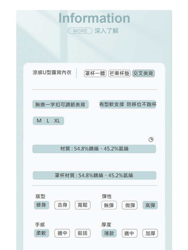 【A&R】輕奢冰絲涼感U型美背細肩帶內衣 材質 : 54.8%錦綸、45.2%氨綸尺寸 : L顏色 : 輕奢奶白產地 : China洗滌方式 : 不可乾洗、不可烘乾、不可使用漂白成分之洗衣品《建議手洗,深淺色衣物需分開浸泡和洗滌》洗衣水溫度不得高於30攝氏度●此為私密物品,只提供鑑賞,退貨需保持無使用過且吊牌未拆剪及未下水過的狀態●退貨請於鑑賞期內辦理,必須保持吊卡完整及商品組合之齊全(包含購買商品、附件、內外包裝及包裝彩盒、贈品…等,均務必保持完整齊全)●商品圖片皆為實物拍攝,由於電腦螢幕色差、拍攝光線等因素,照片與實物會略有差別,商品以實物為準。#A&R #輕奢 #冰絲 #涼感 #U型 #美背 #細肩帶 #內衣 #無鋼圈 #可調節 #可交叉 #收副乳 #防下垂 #高彈 #透氣