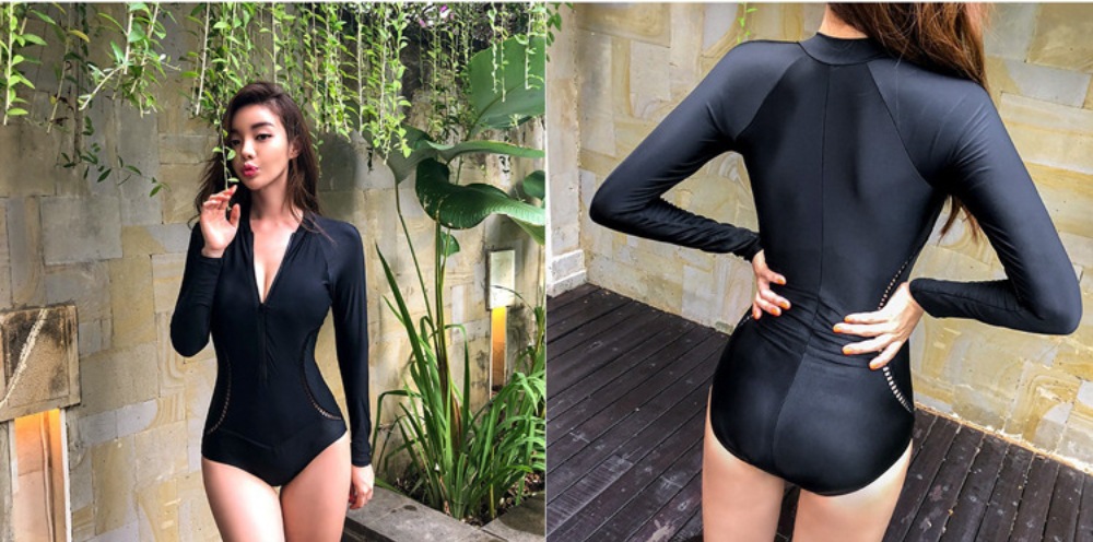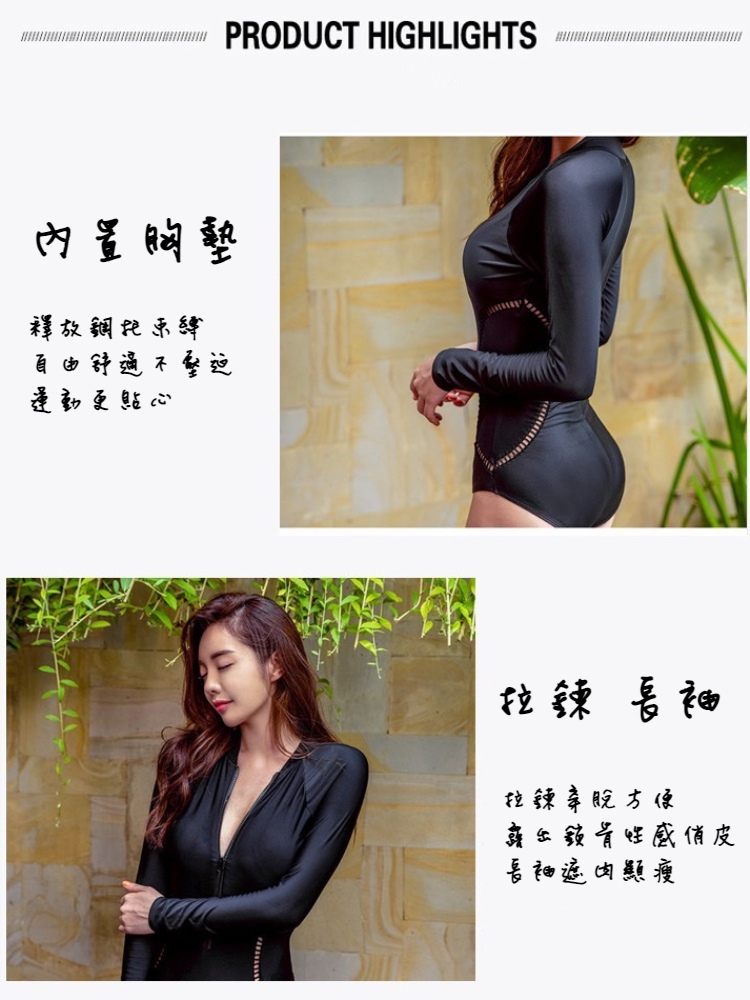 【A&R】韓版連身鏤空長袖防曬泳裝 附防水手提袋 - XL