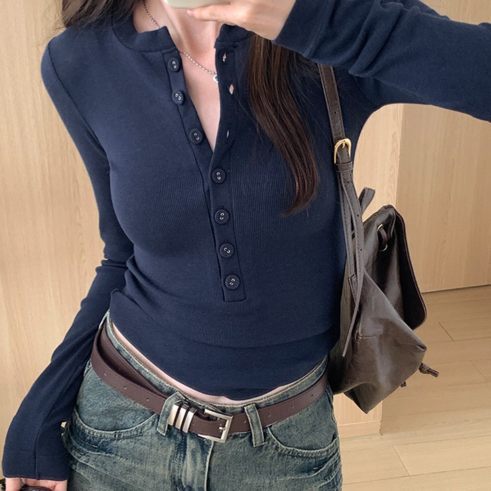 【A&R】設計感修身顯瘦螺紋鈕扣長袖T恤 深海藍,L