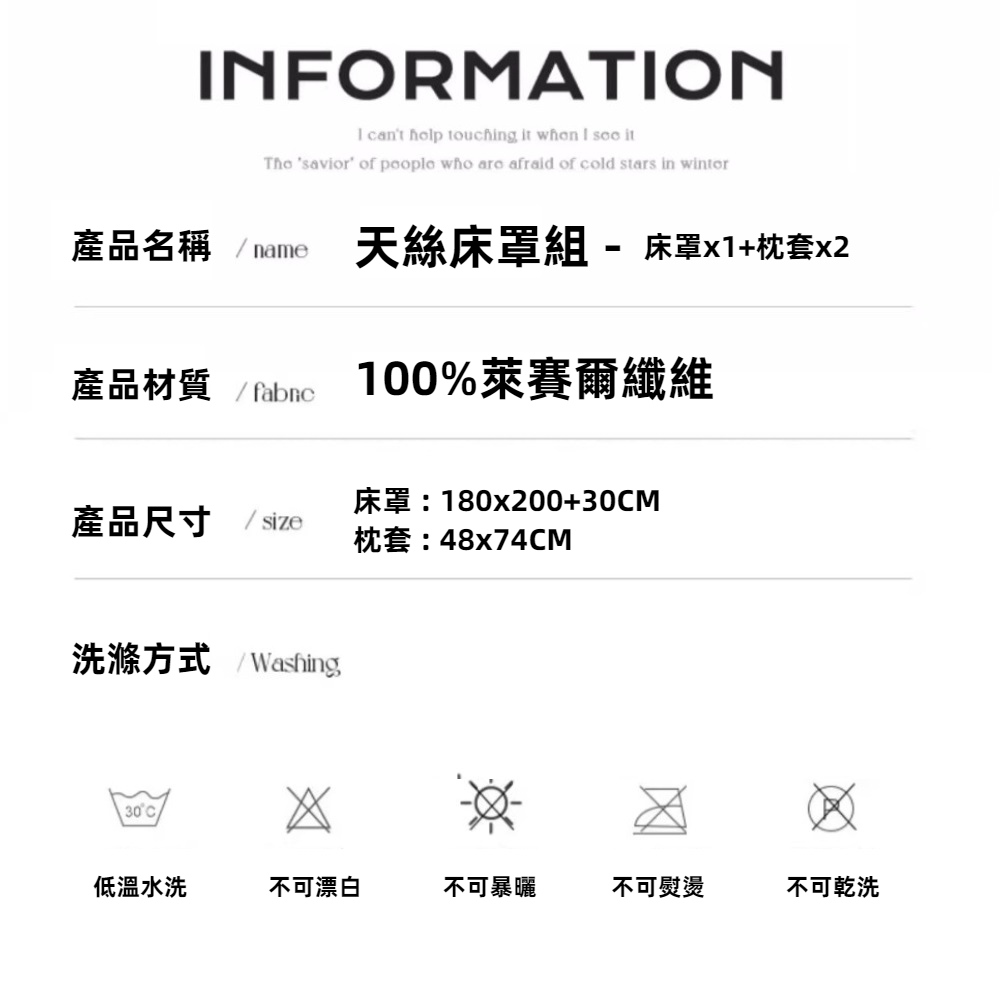 【A&R】三件組 100%天絲床罩組180x200cm 材質:100%萊賽爾纖維(天絲)60支 床罩尺寸: 180x200+30cm(加高款) 枕套尺寸:48x74cm 顏色:綠 產地:China 檢驗登記碼BSMI::M3F499 內容物:床罩x1+枕套x2 洗滌方式:低溫水洗、不可漂白、不可暴曬、不可熨燙、不可乾洗不可高溫烘,請用自然涼乾,請手洗,若機洗請務必裝洗衣袋,以免造成產品本體受損 溫馨提醒:商品因手工測量方式不同,存在1-2cm誤差,屬合理範圍。商品圖檔顏色因電腦螢幕設定差異會略有不同,以實際商品顏色為準,請見諒。 #A&R #三件組 #100%天絲 #床罩組 #180x200cm #床單 #床包 #枕套 #加高款 #萊賽爾纖維 #60支