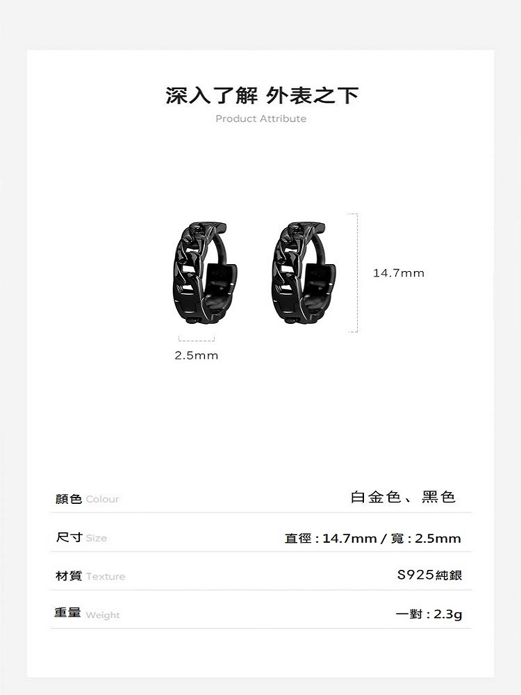 韓版s925純銀鎖鏈耳扣款耳環 單入材質:s925純銀顏色:白金色尺寸:寬約2.5mm、直徑約14.7mm數量:單入產地:China包裝採用馬卡色系飾品盒(隨機出貨)●飾品保養小叮嚀●.飾品需保持乾燥勿碰水,請在每日配戴後用面紙將汗水,汙漬擦拭乾淨,如有拭銀布可再擦拭一遍保持飾品光澤,避免飾品產生變質、氧化。.飾品請勿直接接觸化妝品、香水、清潔劑、海水、雨水、清水,無論是洗手、入 浴、就寢、運動或作家事,請先將飾品取下收妥。.建議穿著打扮時, 飾品最後才穿戴上。.如有體質特殊過敏情況請勿持續佩帶。.請勿接觸高溫及火源區。●備註●.本商品基於個人衛生問題,經拆封使用後,或保養不當發生氧化現象恕無法退換,以確保下一位顧客權益。.七天鑑賞期內退換貨請保持商品完整性,若有贈品、配件煩請一起退回,若有缺件、商品毀損不完整情況發生,恕無法退換貨。.商品圖檔顏色因電腦螢幕設定差異會略有不同,以實際商品顏色為準,請見諒。#韓版 #s925純銀 #鎖鏈 #耳扣款 #耳環 #單入 #二色 #白金 #黑色 #男女款 #抗過敏 #混搭 #個性 #情人節 #生日 #禮物