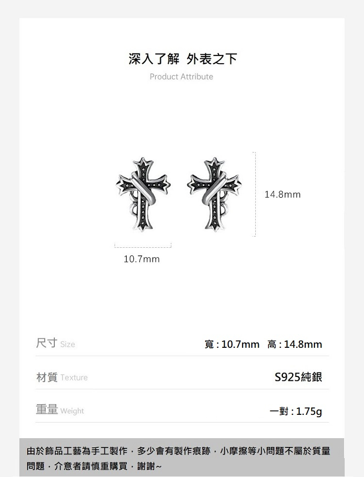 韓版s925純銀復古十字架耳釘款耳環材質:s925純銀尺寸:寬約10.7mm、直徑約14.8mm數量:耳環1對產地:China包裝採用馬卡色系飾品盒(隨機出貨)●飾品保養小叮嚀●.飾品需保持乾燥勿碰水,請在每日配戴後用面紙將汗水,汙漬擦拭乾淨,如有拭銀布可再擦拭一遍保持飾品光澤,避免飾品產生變質、氧化。.飾品請勿直接接觸化妝品、香水、清潔劑、海水、雨水、清水,無論是洗手、入 浴、就寢、運動或作家事,請先將飾品取下收妥。.建議穿著打扮時, 飾品最後才穿戴上。.如有體質特殊過敏情況請勿持續佩帶。.請勿接觸高溫及火源區。●備註●.本商品基於個人衛生問題,經拆封使用後,或保養不當發生氧化現象恕無法退換,以確保下一位顧客權益。.七天鑑賞期內退換貨請保持商品完整性,若有贈品、配件煩請一起退回,若有缺件、商品毀損不完整情況發生,恕無法退換貨。.商品圖檔顏色因電腦螢幕設定差異會略有不同,以實際商品顏色為準,請見諒。#韓版 #s925純銀 #復古 #十字架 #耳釘款 #耳環 #男款 #女 #抗過敏 #個性 #情人節 #生日 #禮物 #混搭 #潮流
