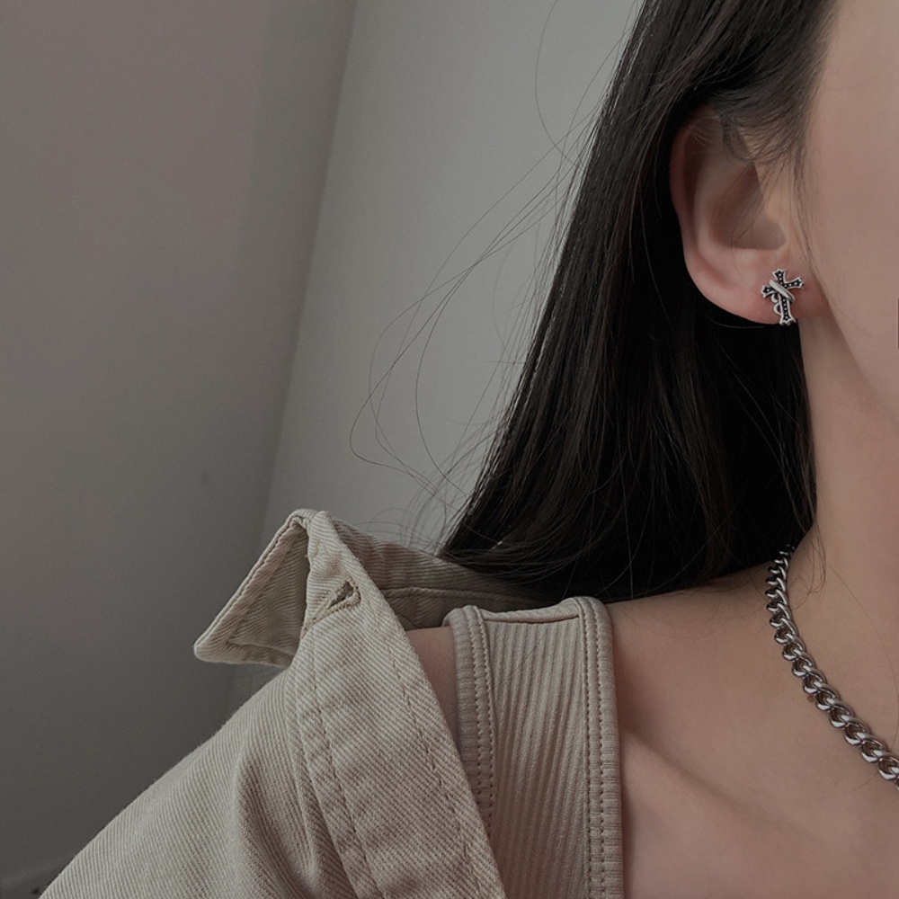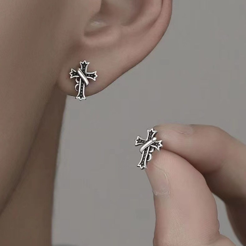 韓版s925純銀復古十字架耳釘款耳環 男女適用 -附馬卡收納盒