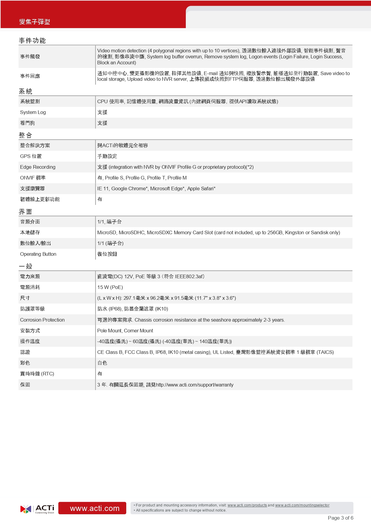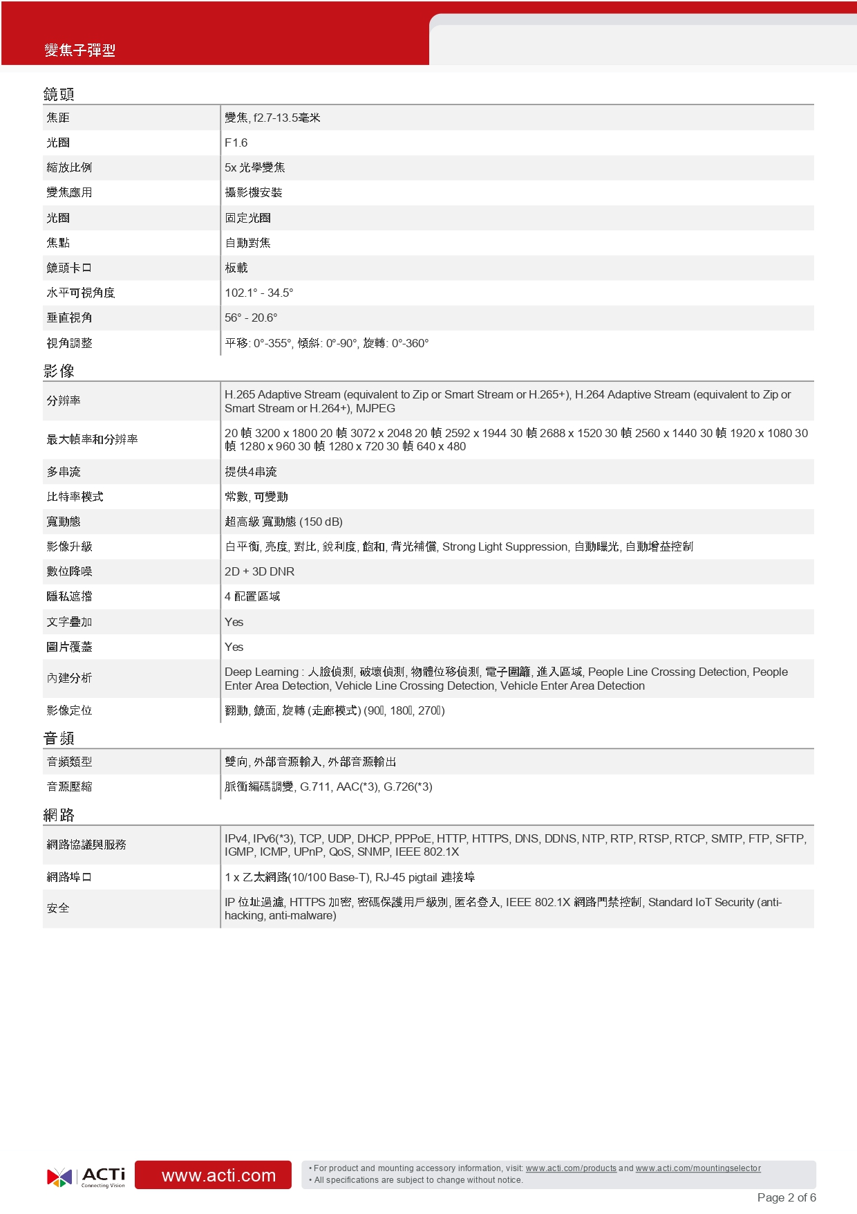 昌運監視器 ACTi A423變焦子彈型攝影機(600萬畫素)5x 紅外線 85公尺 150 dB 臺灣物聯網資安認證