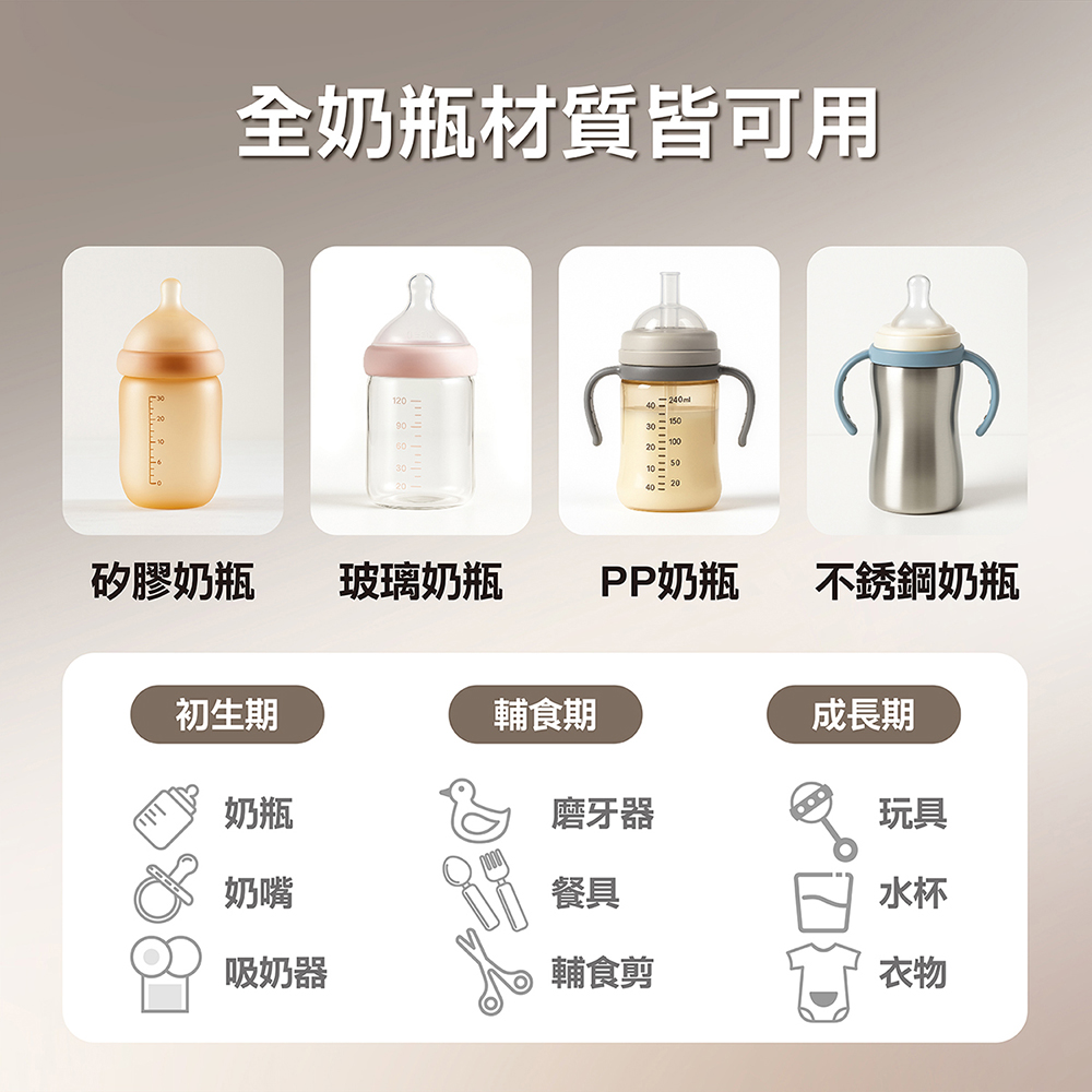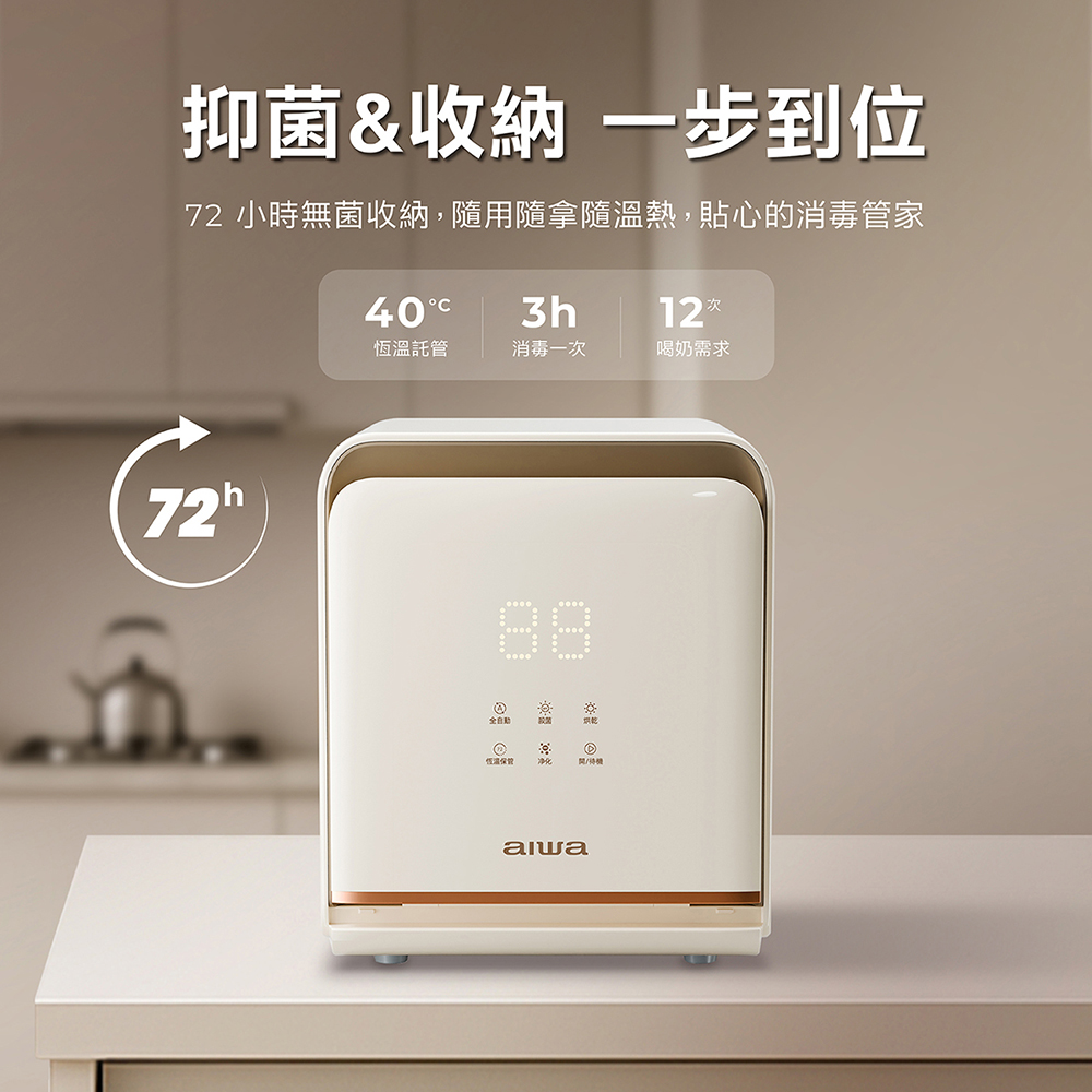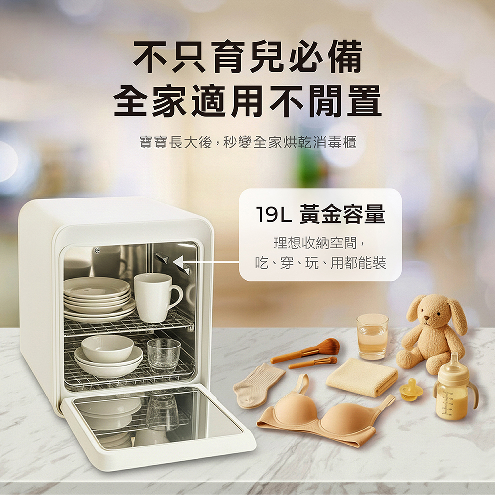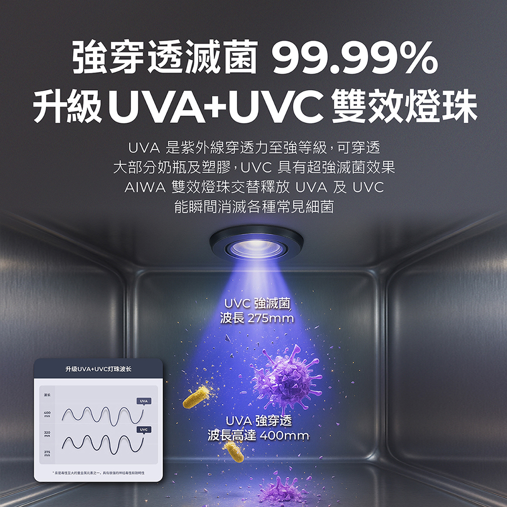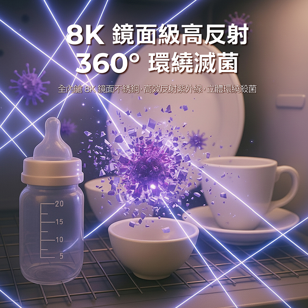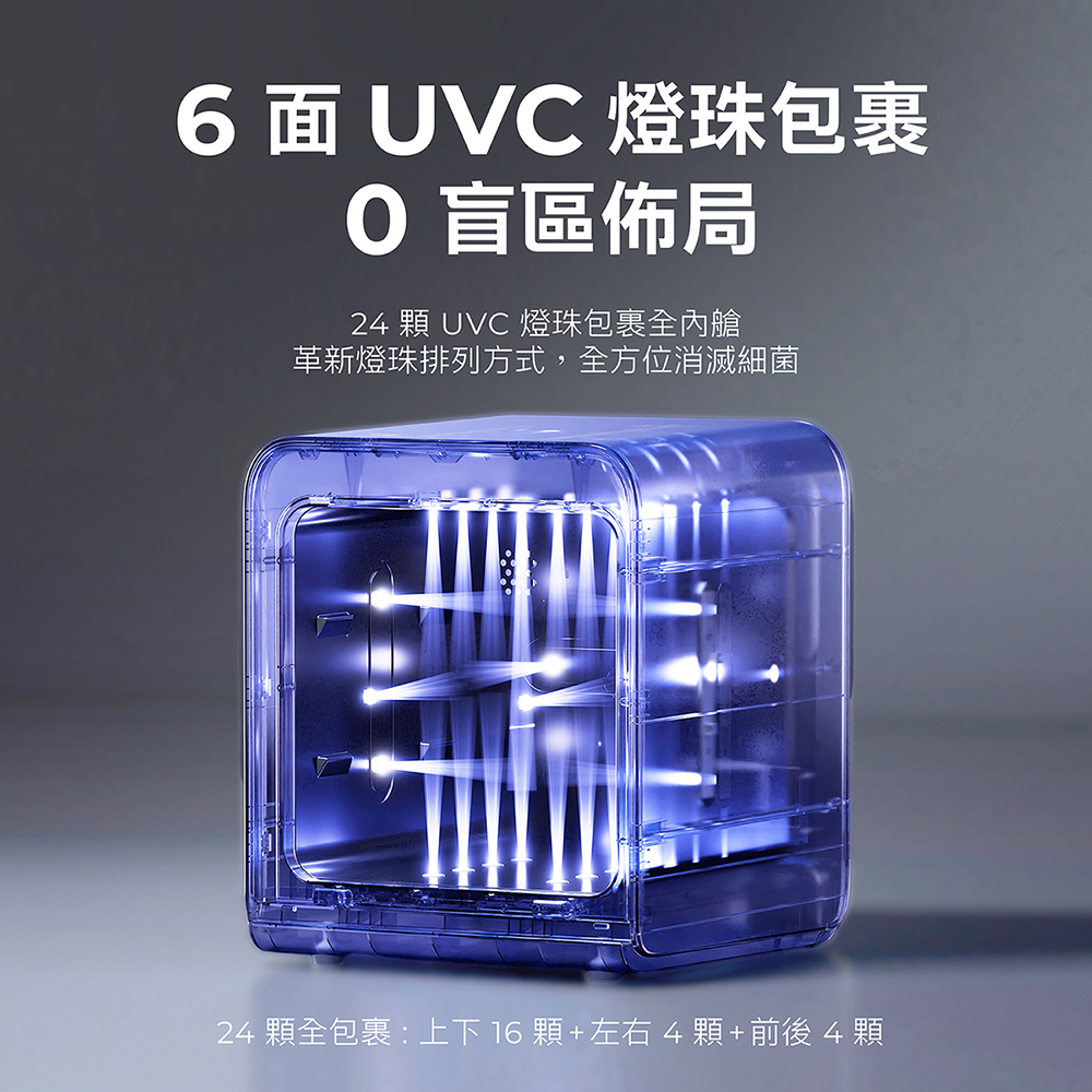 .6面燈珠包裹,24顆UVC全布局.8K鏡面反射,360°殺菌無死角.新升級等離子,迅速消滅病毒.無菌長效保管,72H恆溫收納.靜音強力暖烘,60℃漩渦速乾.UVA+UVC燈珠,強穿透強滅菌.避免二次污染,HEPA複合過濾系統.無毒UVC燈珠,不含汞不釋放臭氧.圖示觸控面板,全自動/殺菌/烘乾/保管/淨化.19L黃金容量,0~99歲全齡陪伴.SGS:腸病毒71型、金黃色葡萄球菌、腸道沙門氏菌、大腸桿菌滅菌率>99.9%