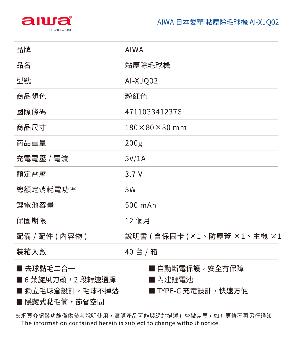 .去球黏毛二合一.6葉旋風刀頭,2段轉速選擇.獨立毛球倉設計,毛球不掉落.隱藏式黏毛筒,節省空間.自動斷電保護,安全有保障.內建鋰電池.TYPE-C充電設計,快速方便