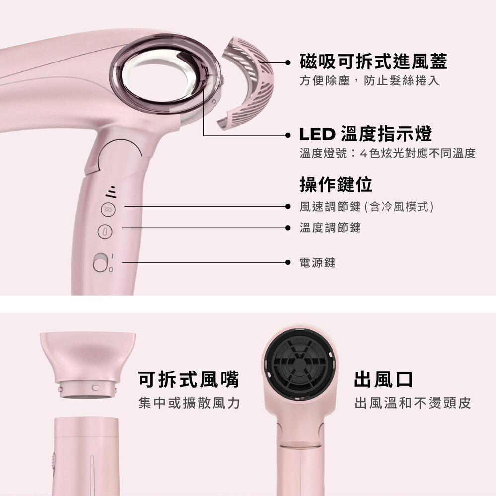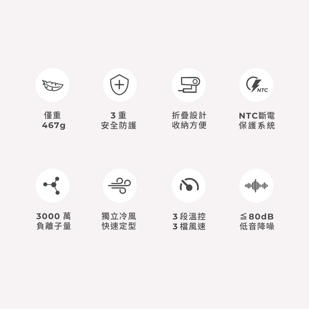 .負離子數大於3000萬個 / cm².3段風速,4種溫度選擇.3 重安全防護.符合握持 科學舒適設計,摺疊設計 , 收納省空間.超輕複合材料 ,整機僅重467g .磁吸式金屬進氣風口防塵網,拆裝方便容易清洗