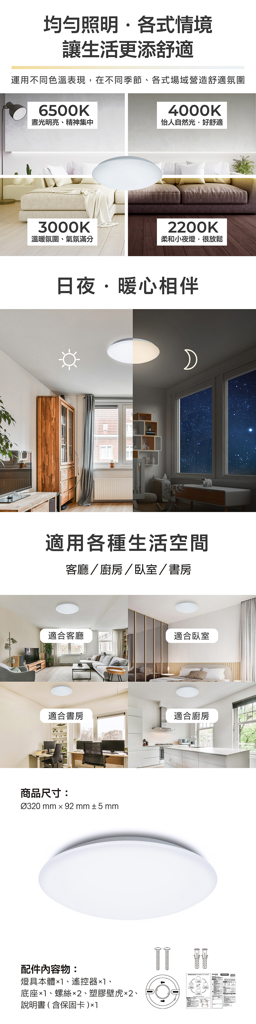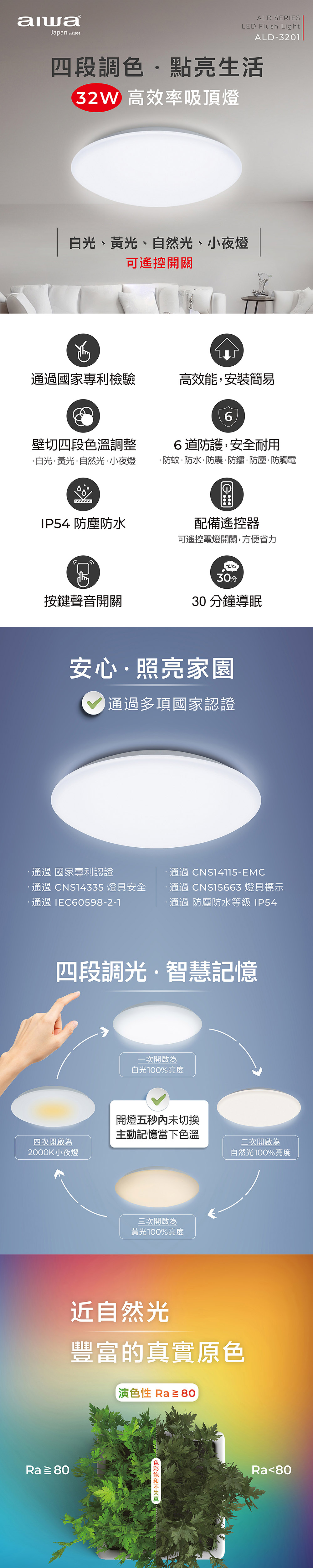 .30分鐘導眠.IP54防塵防水.按鍵聲音開關.壁切四段色溫調整 白光/自然光/黃光/小夜燈.6道防護,安全耐用 防蚊/防水/防震/防鏽/防塵/防觸電.記憶當下色溫 開燈五秒內未切換,主動記憶當下.通過國家專利檢驗、高效能安裝簡易