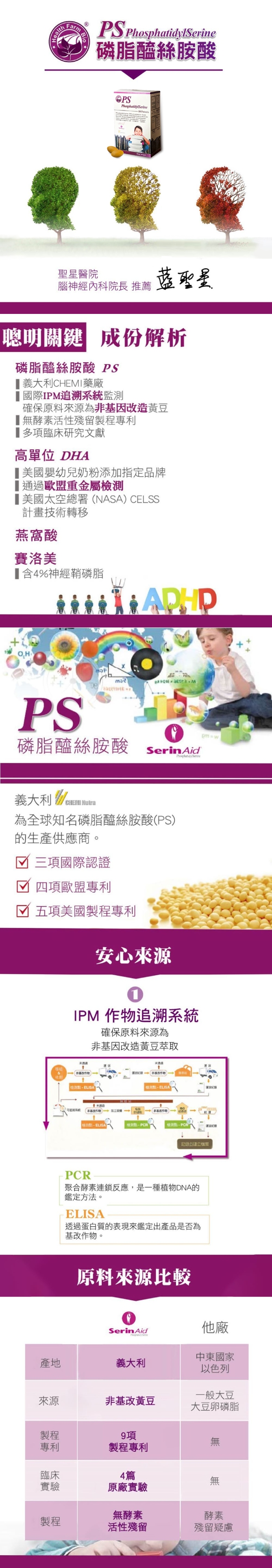 嚴選天然大豆萃取物(含磷脂醯絲胺酸PS)、專利rTG-Form魚油(含70%DHA、10%EPA)牛乳清蛋白萃取物(含燕窩酸)與牛乳萃取物(含賽洛美),完整提供材料,優質認證來源及專利製程生產,幫助調整體質,提高專注力及學習能力。