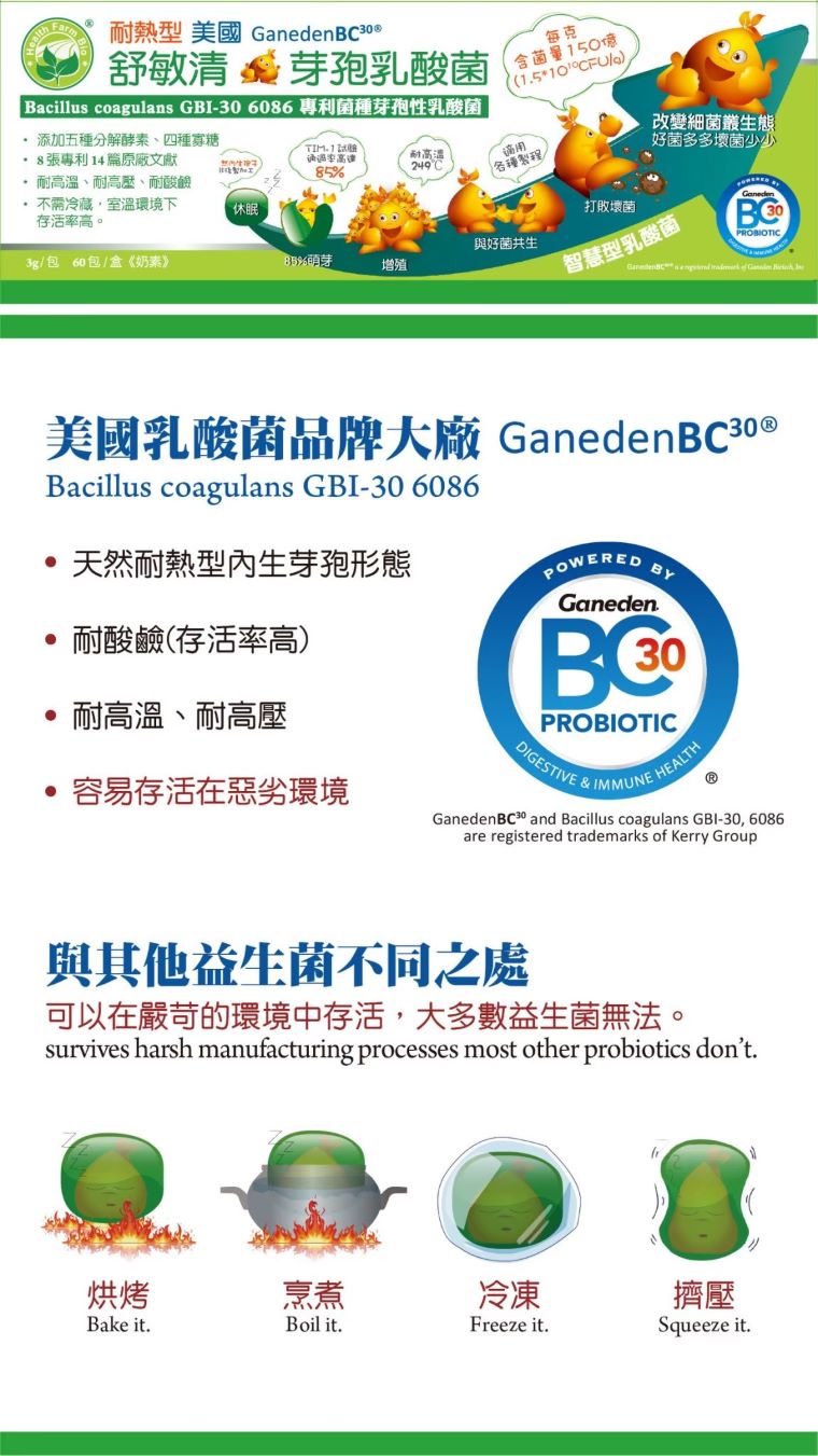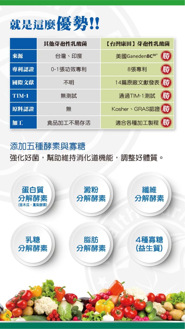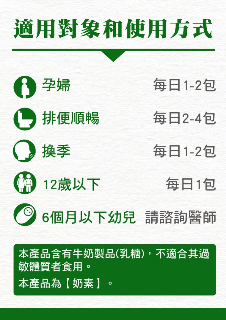 乳糖、優酪乳粉、麥芽糊精、澱粉分解酵素、芽孢乳酸菌(Bacillus coagulans GBI-30 6086)、木瓜濃縮物(含木瓜酵素)、鳳梨濃縮物(含鳳梨酵素)、纖維分解酵素、乳糖分解酵素、脂肪分解酵素、木寡糖、菊糖、果寡糖、異麥芽寡糖。