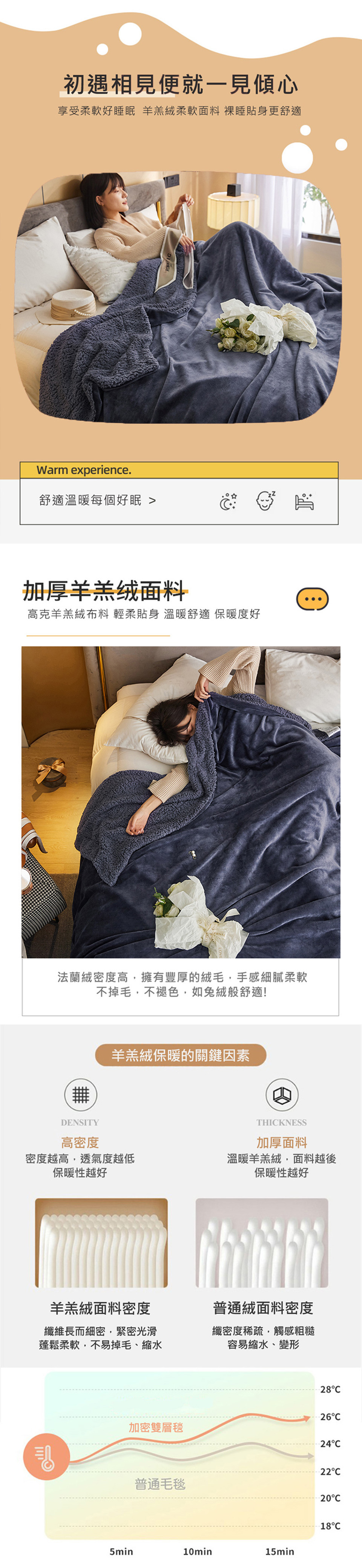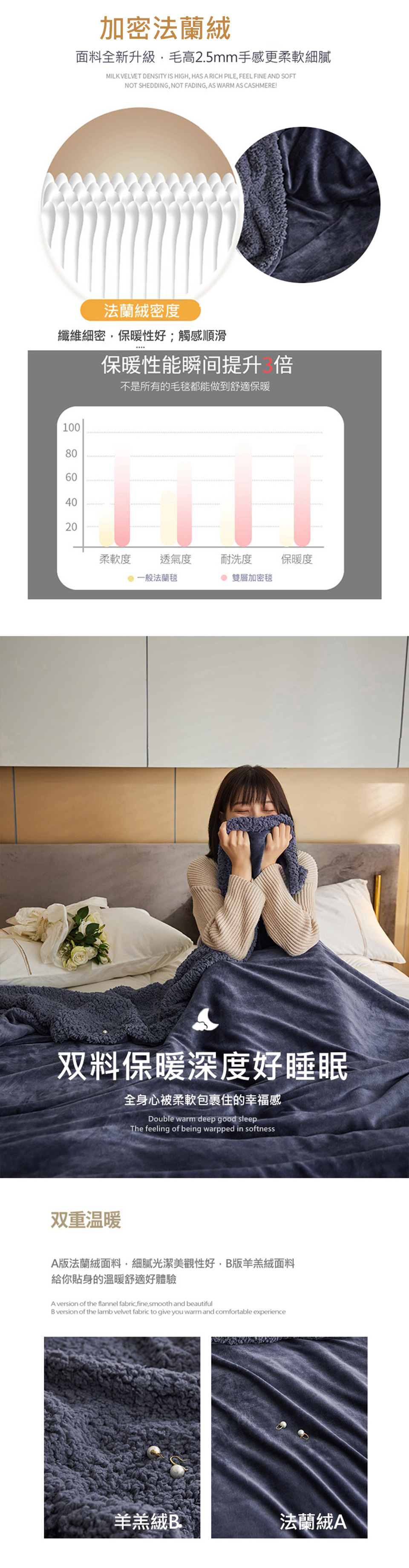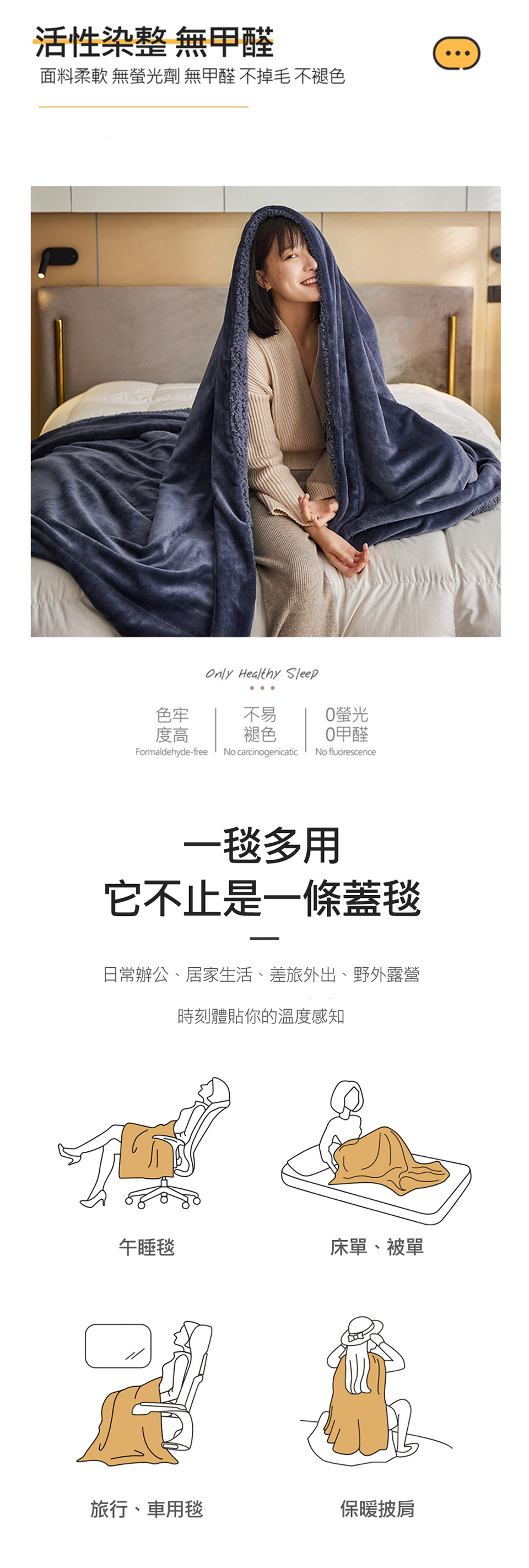 【產品特色】 享受親柔舒眠的體驗!就選法蘭絨 羊羔絨毯被!讓您無論在沙發、電腦桌前休憩或是床鋪上睡眠,都能享有即刻的保暖!簡約素雅的顏色,適合全家大小使用!舒適保暖,令人愛不釋手的聖品,冬季保暖最佳首選喔~【產品配件/尺寸】商品組合:法蘭絨 羊羔絨厚暖毯被 x 1件 尺寸:150x200cm ±5% 表面材質:法蘭絨 (100%聚酯纖維)底面材質:羊羔絨 (100%聚酯纖維)保養方式:可水洗、機洗(建議放入洗衣袋中洗滌)使用中性洗滌劑。請勿漂白。洗滌後;於暖日中曝曬。可使用低溫烘乾。 顏色:如圖,網頁產品因拍攝關係,與實品略有差異,實品顏色更佳 。產品圖僅供參考,不含拍攝道具,實際內容以包裝規格為主。※因布料裁切位置的不同,部份花版可能會與商品圖略有出入,請以收到的實品為主。◆注意事項: 網路購物享有鑑賞期,非試用期,個人衛生用品,經拆封使用後恕不接受退換貨。(請於鑑賞期內確定尺寸規格無誤再使用)商品如經拆封、使用、下水、或拆解以致缺乏完整性及失去再販售價值時,恕無法退貨!
