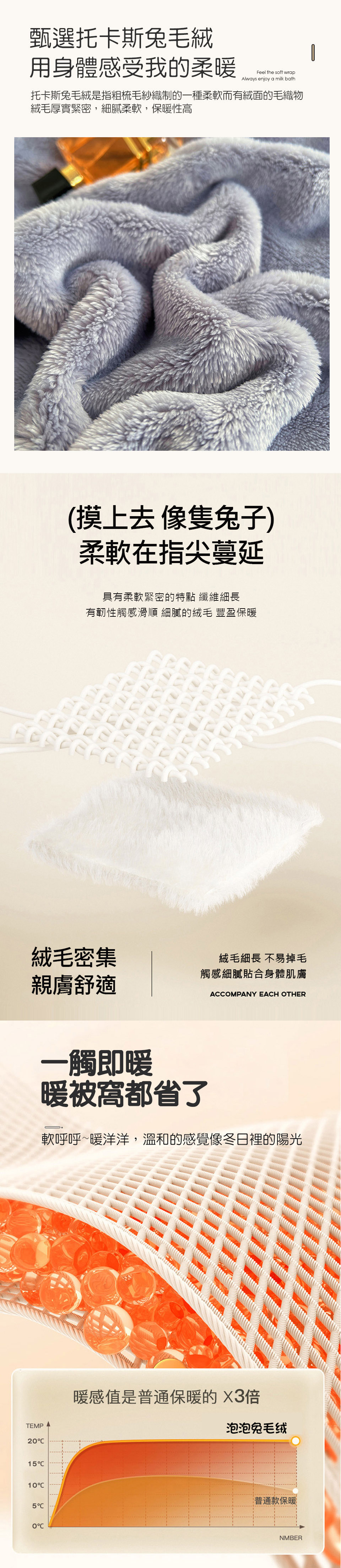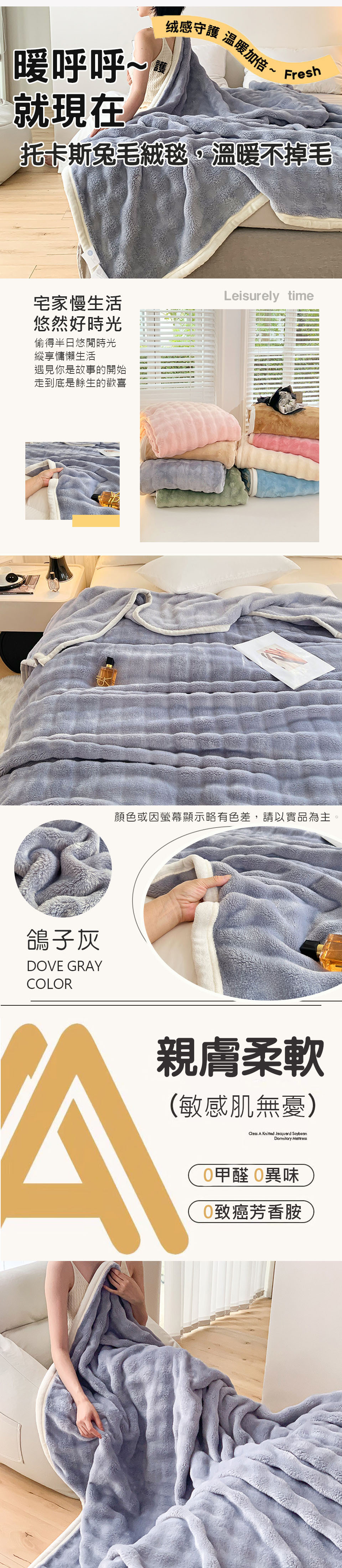 【產品特色】 享受親柔舒眠的體驗!托卡斯兔絨毯;採用泡泡壓花工藝,美觀實用,讓您無論在沙發、電腦桌前休憩或是床鋪上睡眠,都能享有即刻的保暖!簡約素雅的顏色,適合全家大小使用!親膚舒適,令人愛不釋手的聖品,冬季保暖最佳首選喔~~【產品配件/尺寸】商品組合:托斯卡泡泡兔毛絨毯 x 1件 尺寸:150x200cm ±5% 材質:托斯卡兔毛絨 (100%聚酯纖維)保養方式:可水洗、機洗(建議放入洗衣袋中洗滌)使用中性洗滌劑。請勿漂白。洗滌後;於暖日中曝曬。可使用低溫烘乾。 顏色:如圖,網頁產品因拍攝關係,與實品略有差異,實品顏色更佳 。產品圖僅供參考,不含拍攝道具,實際內容以包裝規格為主。※因布料裁切位置的不同,部份花版可能會與商品圖略有出入,請以收到的實品為主。◆注意事項: 網路購物享有鑑賞期,非試用期,個人衛生用品,經拆封使用後恕不接受退換貨。(請於鑑賞期內確定尺寸規格無誤再使用)商品如經拆封、使用、下水、或拆解以致缺乏完整性及失去再販售價值時,恕無法退貨!