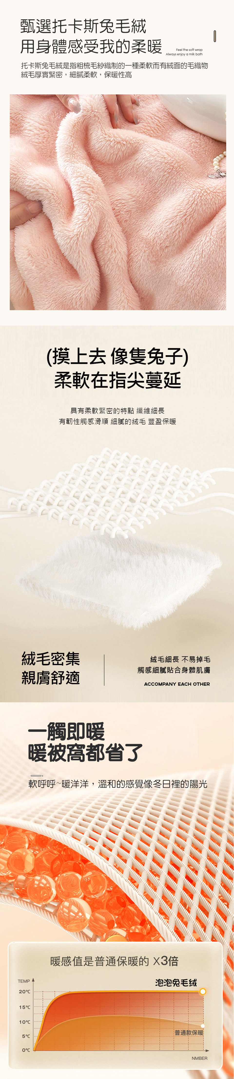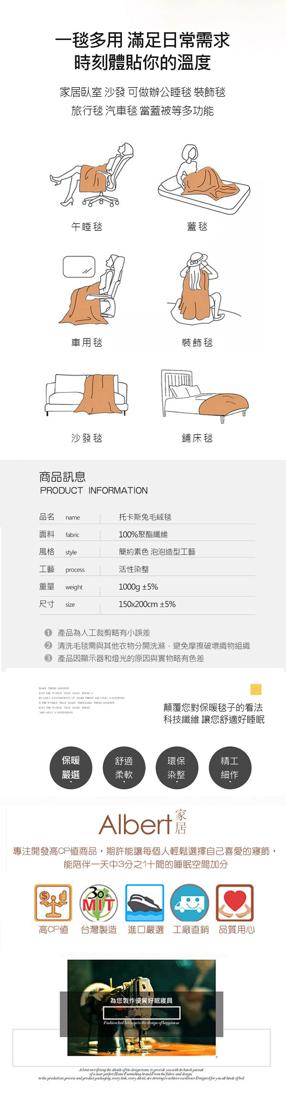 【產品特色】 享受親柔舒眠的體驗!托卡斯兔絨毯;採用泡泡壓花工藝,美觀實用,讓您無論在沙發、電腦桌前休憩或是床鋪上睡眠,都能享有即刻的保暖!簡約素雅的顏色,適合全家大小使用!親膚舒適,令人愛不釋手的聖品,冬季保暖最佳首選喔~~【產品配件/尺寸】商品組合:托斯卡泡泡兔毛絨毯 x 1件 尺寸:150x200cm ±5% 材質:托斯卡兔毛絨 (100%聚酯纖維)保養方式:可水洗、機洗(建議放入洗衣袋中洗滌)使用中性洗滌劑。請勿漂白。洗滌後;於暖日中曝曬。可使用低溫烘乾。 顏色:如圖,網頁產品因拍攝關係,與實品略有差異,實品顏色更佳 。產品圖僅供參考,不含拍攝道具,實際內容以包裝規格為主。※因布料裁切位置的不同,部份花版可能會與商品圖略有出入,請以收到的實品為主。◆注意事項: 網路購物享有鑑賞期,非試用期,個人衛生用品,經拆封使用後恕不接受退換貨。(請於鑑賞期內確定尺寸規格無誤再使用)商品如經拆封、使用、下水、或拆解以致缺乏完整性及失去再販售價值時,恕無法退貨!