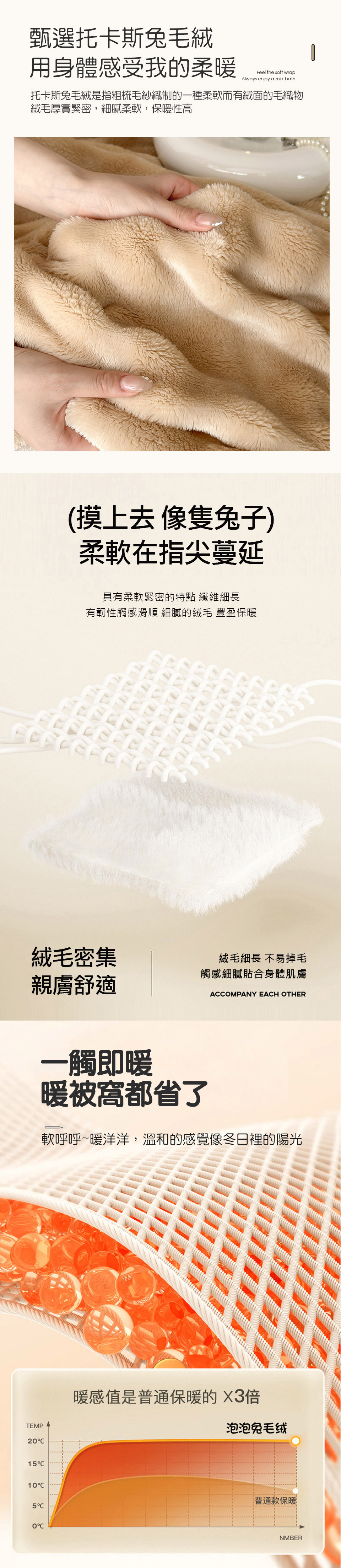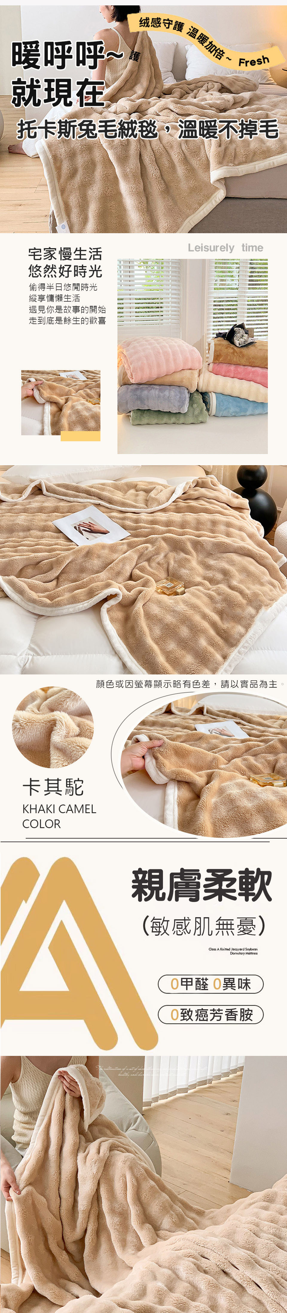 【產品特色】 享受親柔舒眠的體驗!托卡斯兔絨毯;採用泡泡壓花工藝,美觀實用,讓您無論在沙發、電腦桌前休憩或是床鋪上睡眠,都能享有即刻的保暖!簡約素雅的顏色,適合全家大小使用!親膚舒適,令人愛不釋手的聖品,冬季保暖最佳首選喔~~【產品配件/尺寸】商品組合:托斯卡泡泡兔毛絨毯 x 1件 尺寸:150x200cm ±5% 材質:托斯卡兔毛絨 (100%聚酯纖維)保養方式:可水洗、機洗(建議放入洗衣袋中洗滌)使用中性洗滌劑。請勿漂白。洗滌後;於暖日中曝曬。可使用低溫烘乾。 顏色:如圖,網頁產品因拍攝關係,與實品略有差異,實品顏色更佳 。產品圖僅供參考,不含拍攝道具,實際內容以包裝規格為主。※因布料裁切位置的不同,部份花版可能會與商品圖略有出入,請以收到的實品為主。◆注意事項: 網路購物享有鑑賞期,非試用期,個人衛生用品,經拆封使用後恕不接受退換貨。(請於鑑賞期內確定尺寸規格無誤再使用)商品如經拆封、使用、下水、或拆解以致缺乏完整性及失去再販售價值時,恕無法退貨!