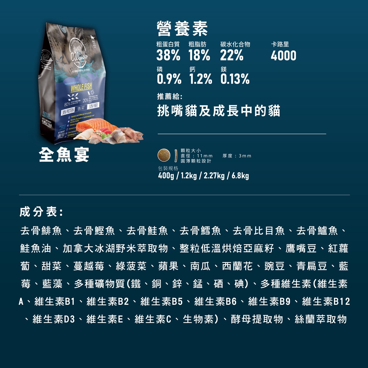 產品名稱:【Allando 奧藍多】天然全方位無穀貓糧2.27kg口味:全魚宴規格:2.27kg產 地:台灣