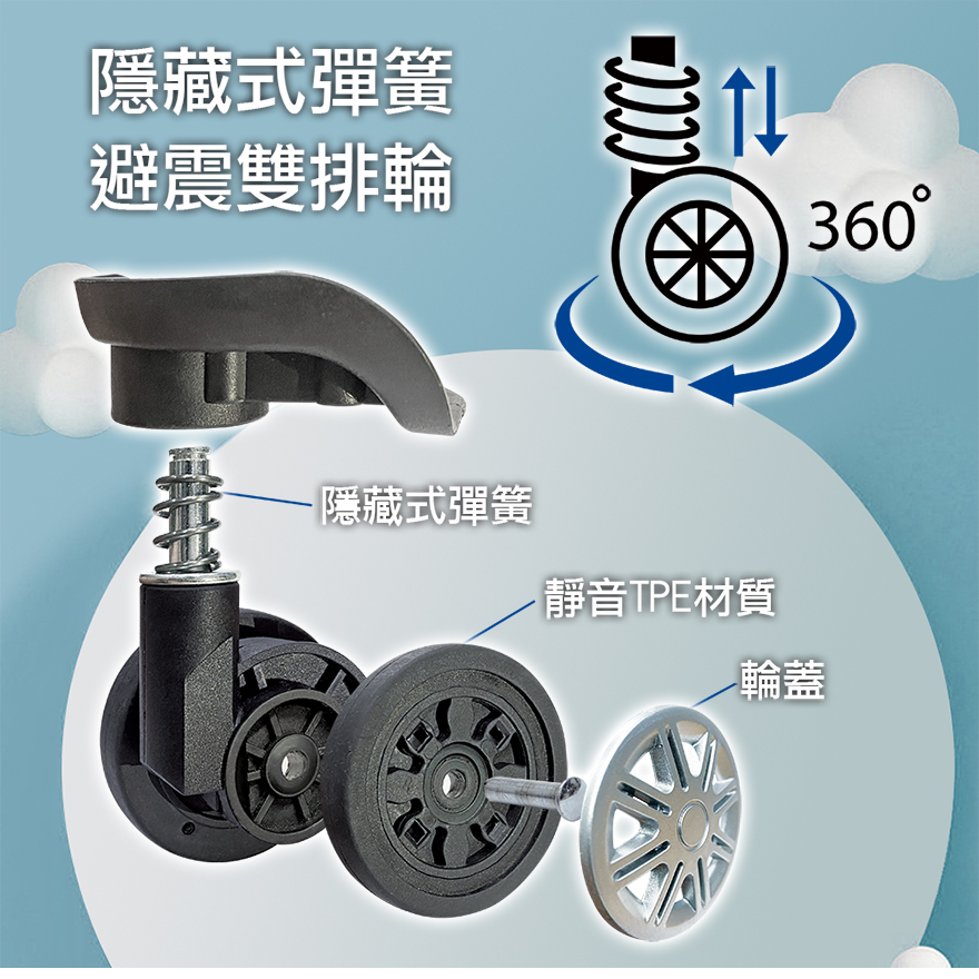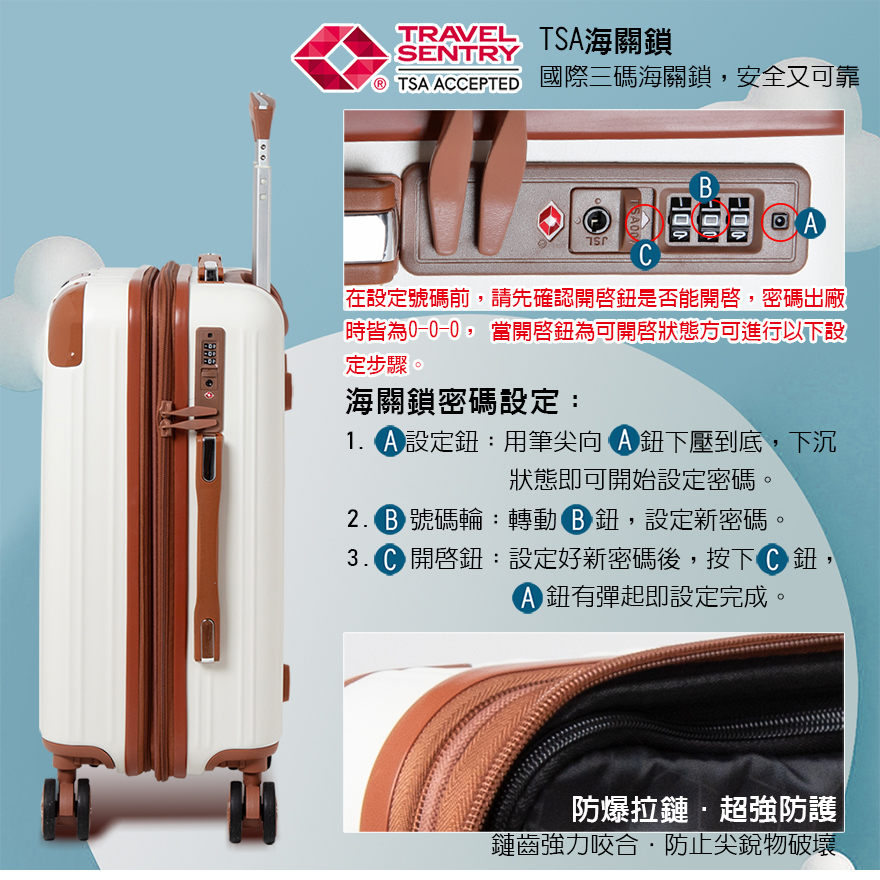 特色:PC+ABS磨砂、隱藏式杯架、後背防磨腳座、防爆雙層拉鏈、掛包扣、TSA海關鎖、雙內裡隔網、雙X型束帶、鋁合金拉桿、60mm避震雙排輪、加大15-30%