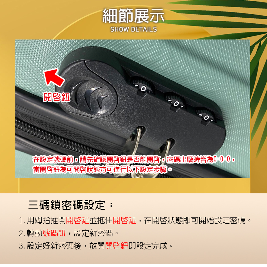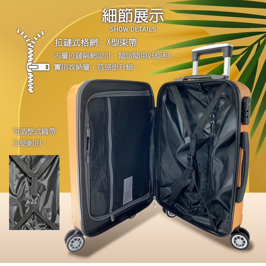 特色:三碼鎖、內裡隔網、雙X型束帶、鋁合金拉桿、立體耐磨側腳座、質感防滑提把、360度飛機輪