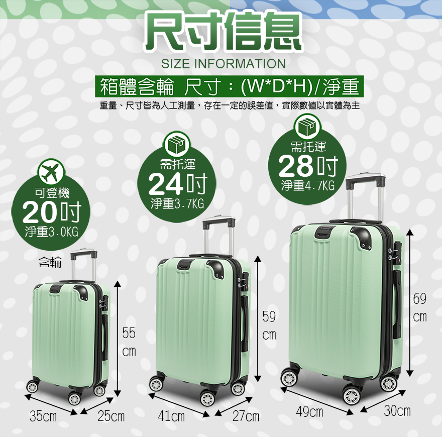 特色:掛包扣、雙內裡隔網、雙X型束帶 TSA海關鎖、鋁合金拉桿、60mm飛機輪、加大15-30%