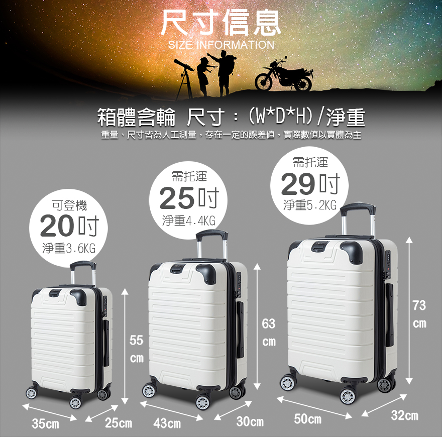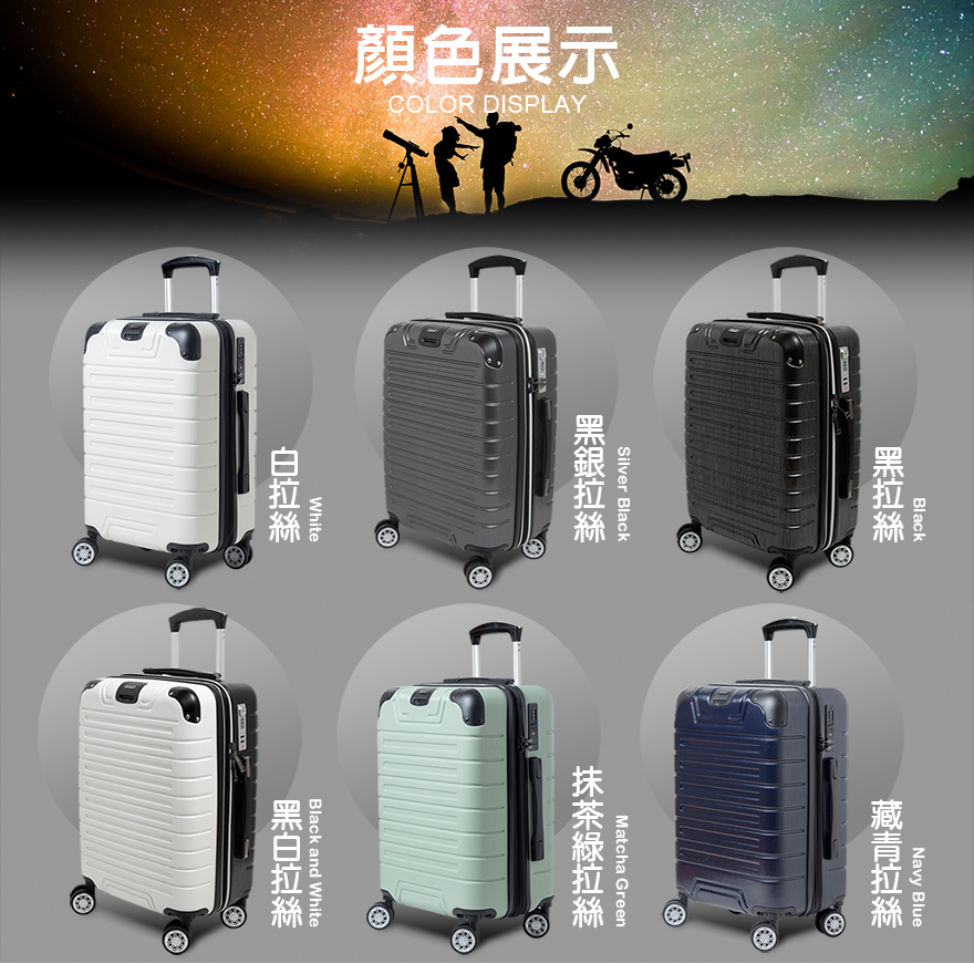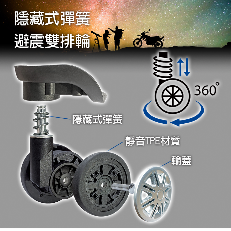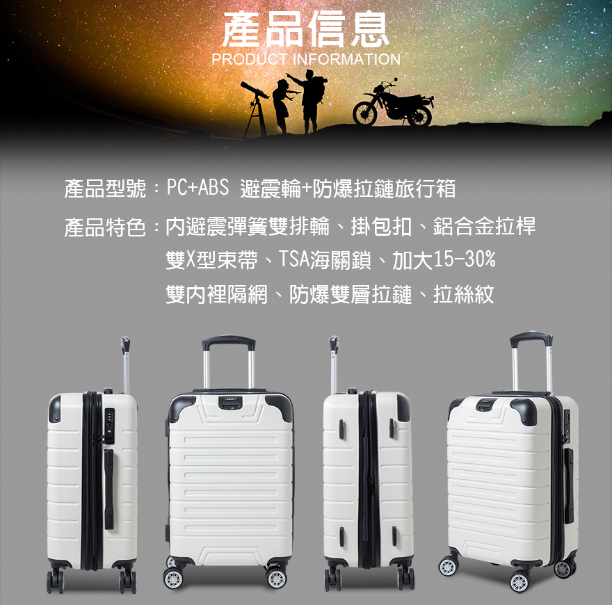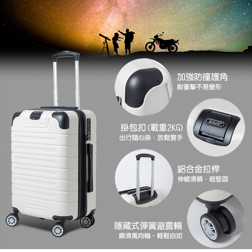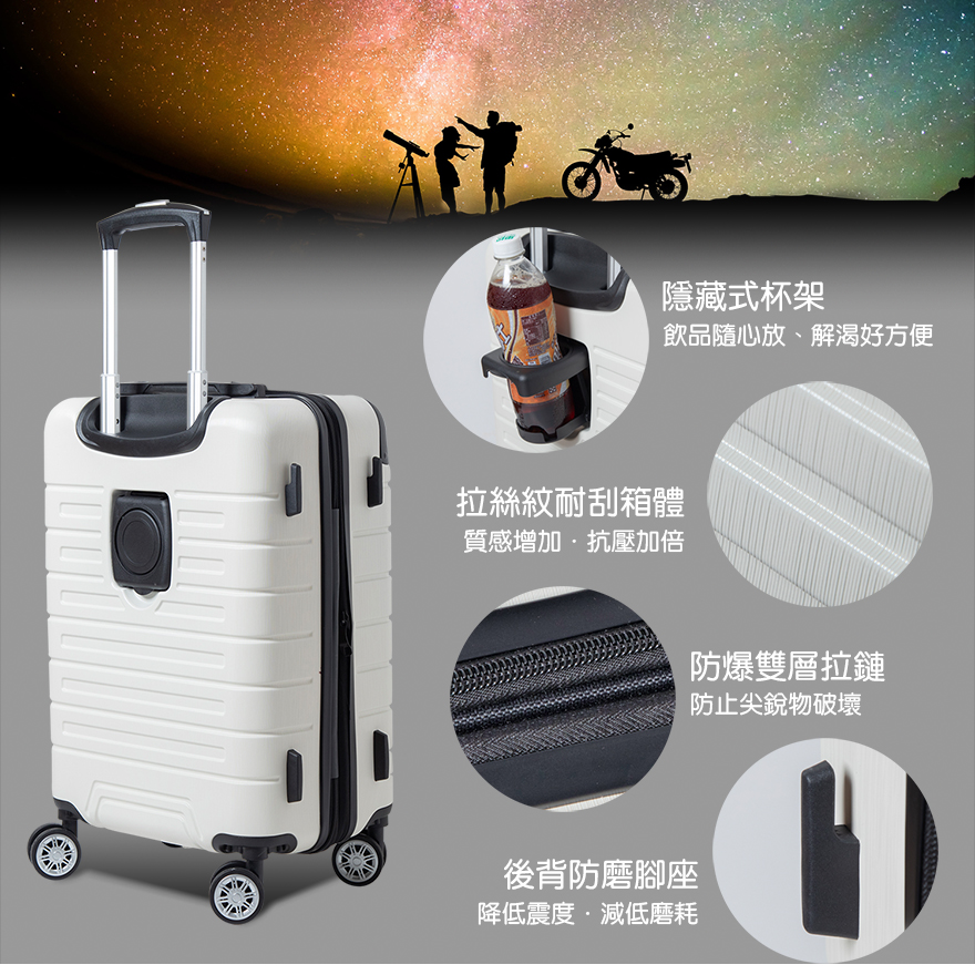 特色:隱藏式杯架、後背防磨腳座、防爆雙層拉鏈、掛包扣、TSA海關鎖、雙內裡隔網、雙X型束帶、鋁合金拉桿、隱藏式彈簧避震輪、加大15-30%