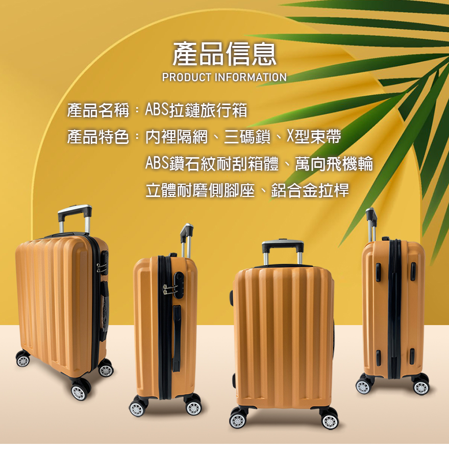 特色:三碼鎖、內裡隔網、雙X型束帶、鋁合金拉桿、立體耐磨側腳座、質感防滑提把、360度飛機輪