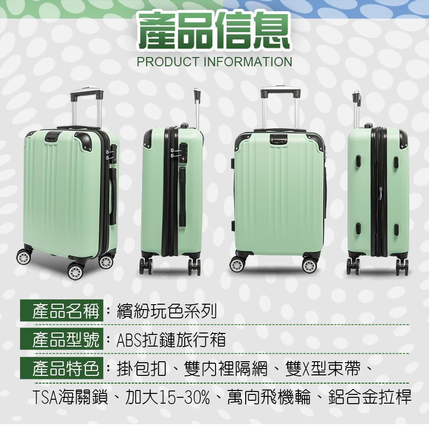 特色:掛包扣、雙內裡隔網、雙X型束帶 TSA海關鎖、鋁合金拉桿、60mm飛機輪、加大15-30%