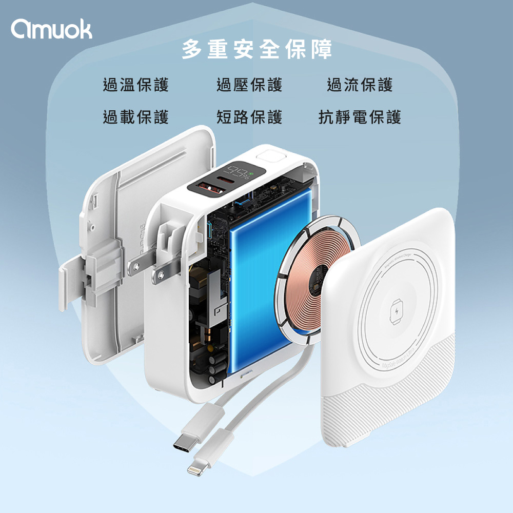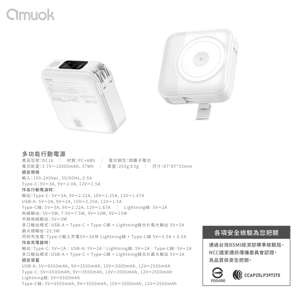● 耳機、手錶可以充● 多重安全保障● 輕量化機身,單手可掌握● 機身有標示Wh及CCC認證