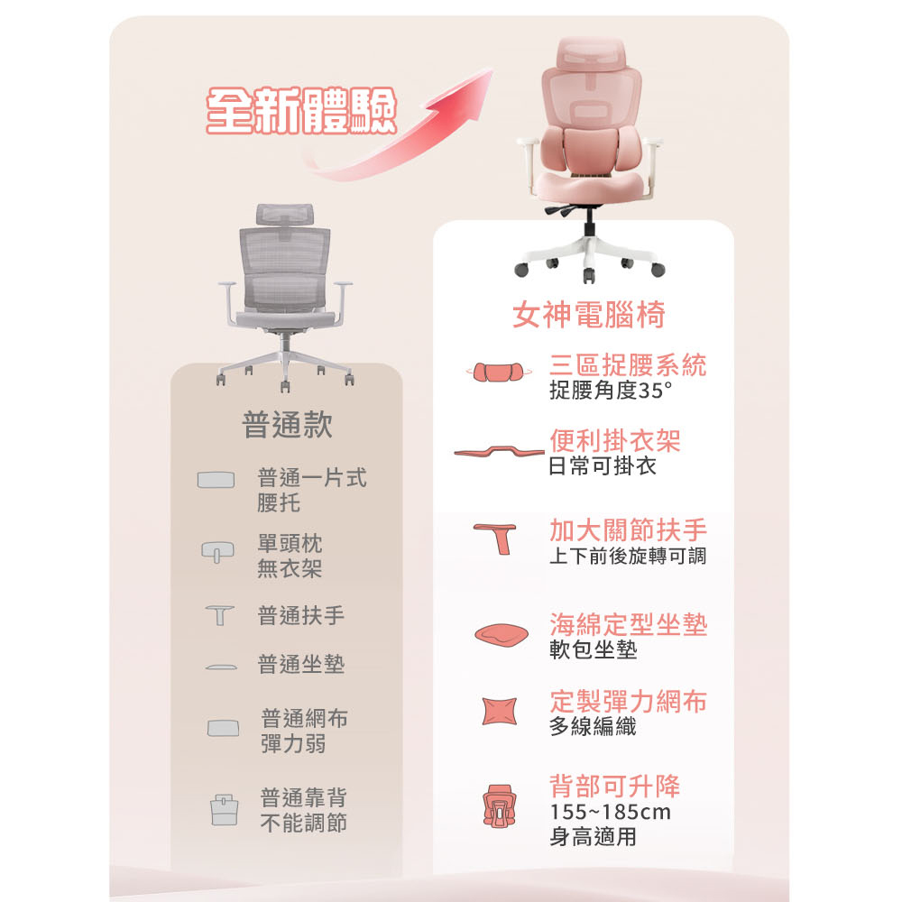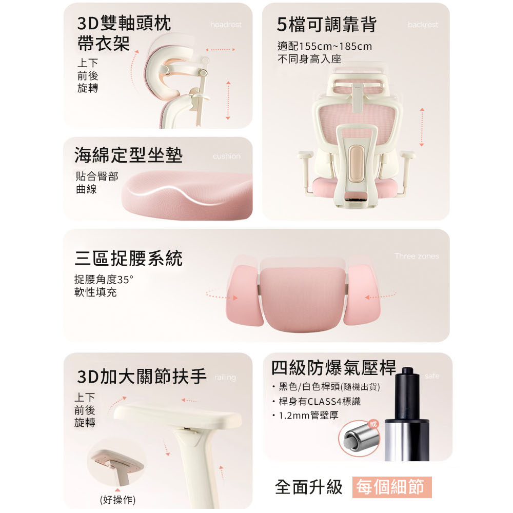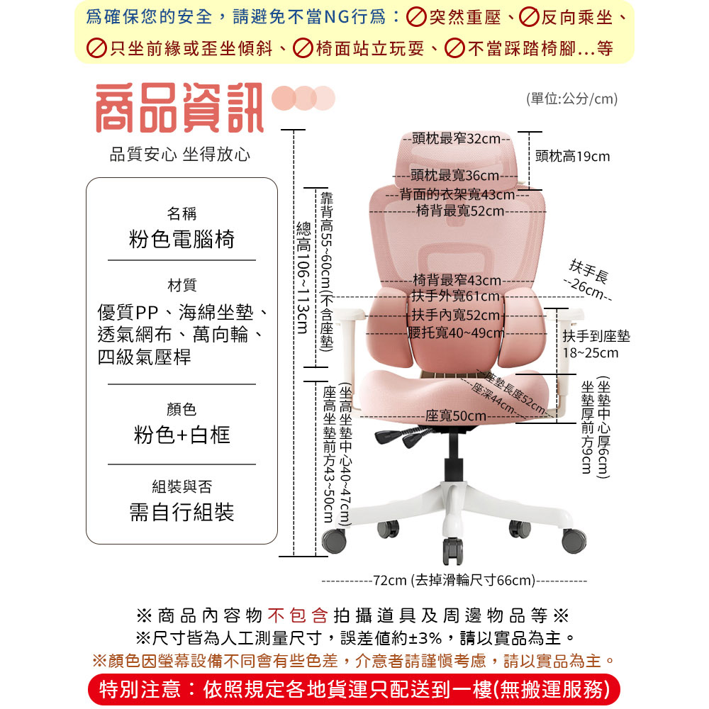 專為女性設計!!3D頭枕 舒適頸椎背部升降 便利掛衣捉腰靠背 定型坐墊1.尺寸:如圖2.材質:PP外框/定型棉坐墊/透氣網布/4級氣壓桿/※注意事項:1.此商品需自行組裝,組裝後恕不退貨,請確認商品零件無誤再組裝。2.由於拍攝光線因素影響,可能導致顏色與實物有些微偏差,圖片僅供參考,實際商品依供貨樣式為準。3.購買前請先量測使用區域尺寸,確定無誤再購買以免造成尺寸不合之狀況,敬請謹慎選購。4.此商品不含情境搭配商品及其他擺設品,拍攝與實品略有色差,顏色請以實際收到商品為準。5.商品組裝前請確認零件有無瑕疵缺件。商品如經拆封、組裝、使用、拆解以致缺乏完整性及失去再販售價值時,恕無法退(換)貨!6.本賣場商品不提供試用,若因消費者的試用導致接觸性的磨損,將影響到您的退貨權益,如有瑕疵請在24小時內回報。 7.如有任何對商品的問題可聊聊詢問,避免產生購物過程不愉快交易! 8.溫馨提醒,鑑賞期非試用期, 敬請確認商品無瑕庛問題並確認購買後再使用。9.配送地點僅止於台灣本島,外島地區(澎湖,金門,馬祖,綠島,小琉球 )無提供服務,敬請見諒。 10.全國各區及各場所僅送到一樓,並無配上樓層服務。11.部分偏遠地區需加收聯運費,實際區域以配合貨運公司官網公布為主!
