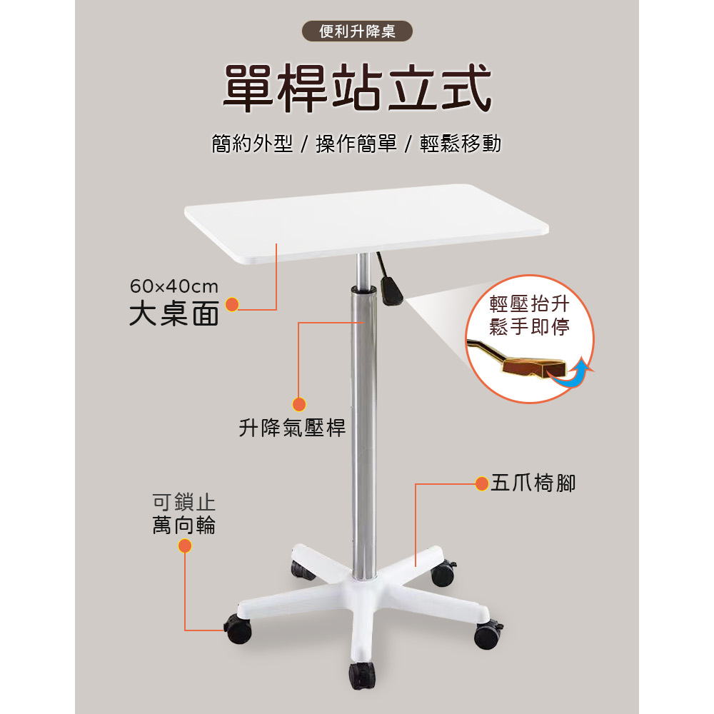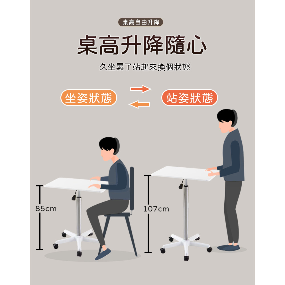 圓潤邊角 避免磕碰 升降功能 自由調節 附萬向輪 移動方便尺寸:60*40*85-107cm±3%