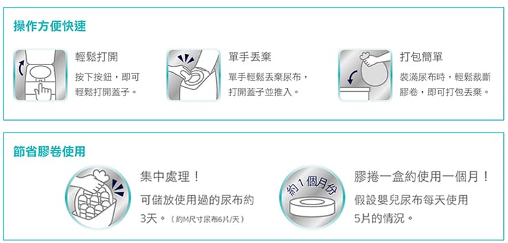 每位媽媽都希望能夠快速又乾淨地處理寶寶用過的紙尿布。NIOI-POI搭載升級版環保綠抗菌除臭α※成分,可有效消除尿布散發的異味並達到抗菌的效果。將尿布處理器放置在寢室或客廳,也不用擔心異味或影響居家環境衛生,是讓人非常安心的產品。※專用膠捲搭配之強力除臭成分